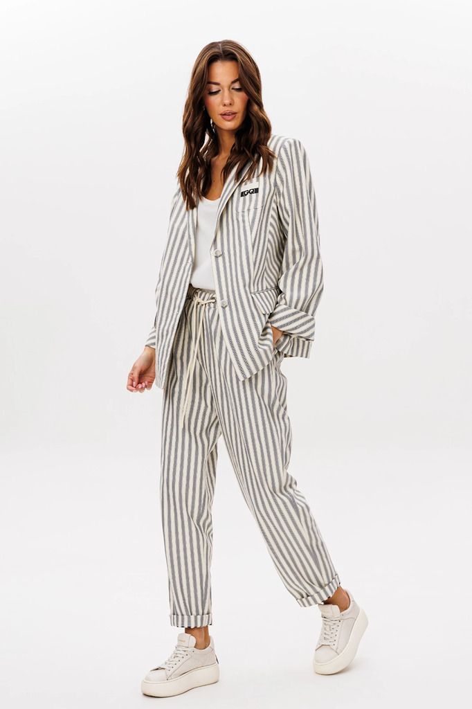 Совместимы ли официальность и комфорт, деловой или спортивный стиль? Судя по нашей модели эти противоположности отлично уживаются друг с другом. Мягкие, расслабленные брюки на резинке и свободный, упр... Показать описаниеямленный пиджак из трендовой льняной полоски - то, что подойдет вам в случае, если хочется создать комфортный образ. Пиджак втачного покроя, с центральной застежкой на петли и пуговицы, классическим английским воротником. Полочки с отрезным бочком, нагрудной вытачкой, прорезным карманом с клапаном и накладным карманом в верхней части левой полочки. Спинка со средним швом. Рукав двухшовный с отложной манжетой. Брюки на эластичном поясе с люверсами и отделочным шнуром, по боковому шву - наклонные карманы. Полочки пиджака с подкладкой. Спинка с частичной подкладкой из основной ткани в области лопаток. Модель дополнена майкой из хлопчатобумажного трикотажного полотна, свободного покроя, без рукавов. Длина пиджака около 70 см. Длина рукава около 62 см. Длина брюк около 100 см. костюм хлопок 65% пэ 33 эластан 2 топ хлопок 96 спандекс 4