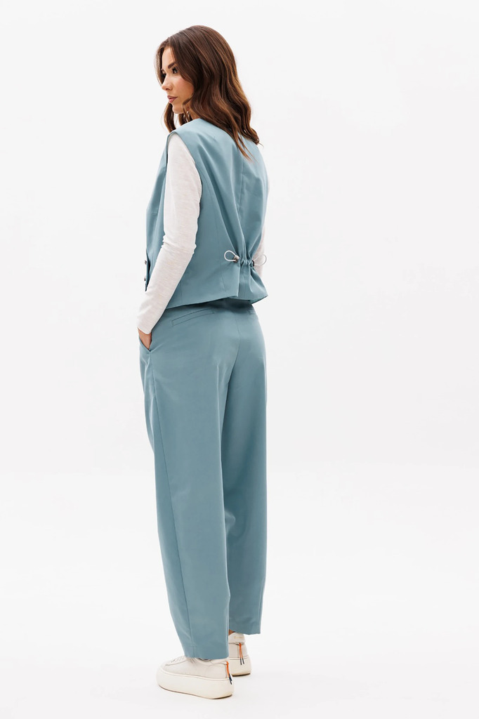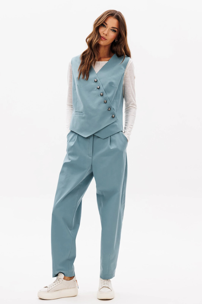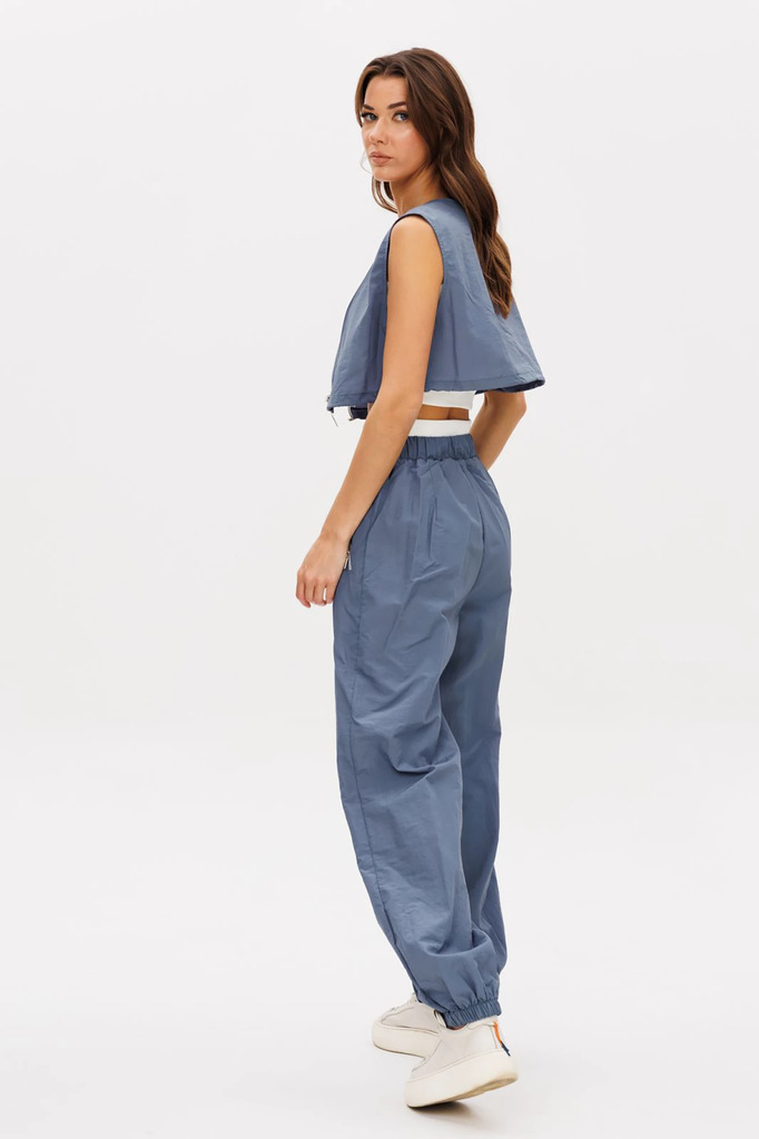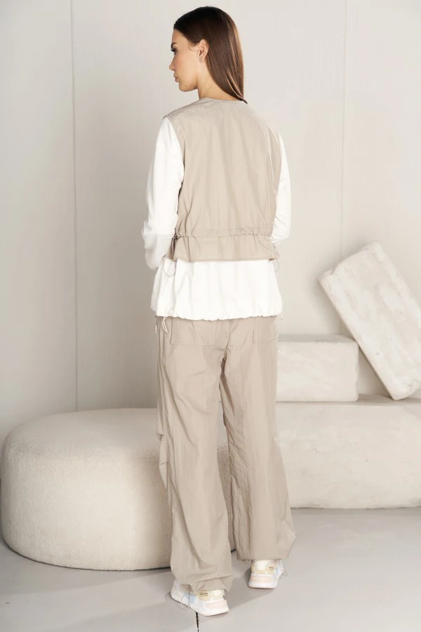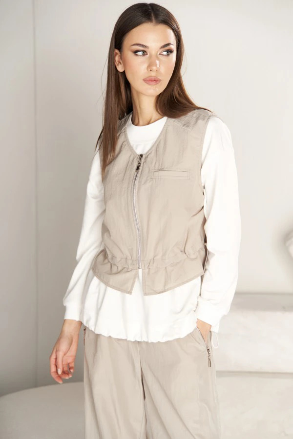 Брючный комплект в неформальном стиле… В текущем сезоне он на пике популярности у модных инфлюэнсеров. Необычные ткани, Мягкие линии кроя, трендовые детали, т.е. все, что непривычно видеть в обычном к... Показать описаниеостюме и всё, что обеспечивает образу игривый «характер».Великолепная тройка, где каждая вещь самодостаточна, но в комплекте дополняет и поддерживает друг друга.Жилет свободный упрямлённый, с круглой горловиной, застёжка на тесьму-молнию, по низу кулиса с эластичной тесьмой и фиксаторами.Длина жилета около 35 см.Брюки в свободном, расслабленном стиле, на эластичном поясе с прорезными карманами на молнии. Пояс с дополнительным эластичным поясом из трикотажного кашкорсе .Длина брюк около 102 см.Майка-топ из трикотажного кашкорсе, с поясом с лёгкой обтяжкой по низу.Длина майки около 30 см. жилет и брюки пэ 100%, топ - хлопок 96%, спандекс 4%.