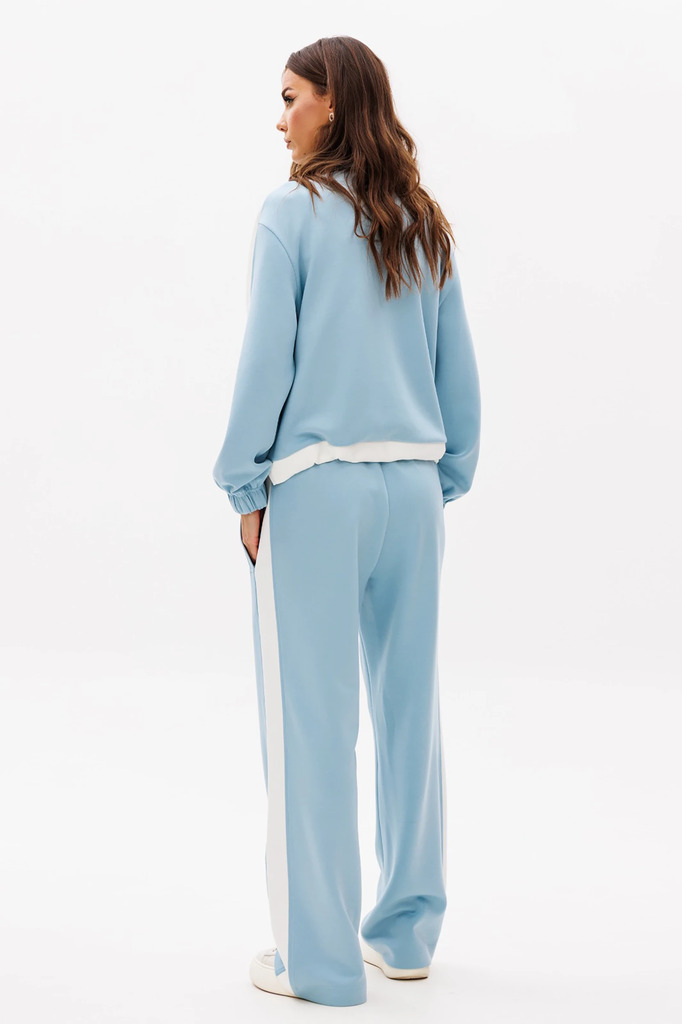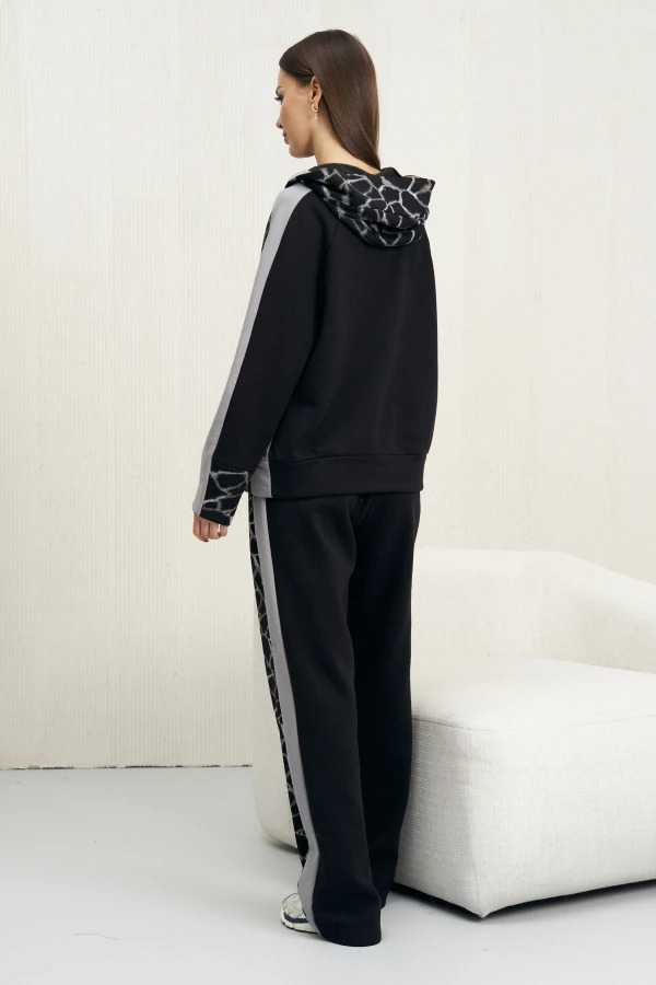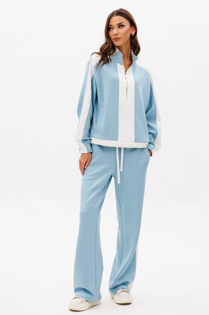 Комфорт - один из ключевых трендов современной действительности, который отлично реализуется в контексте стиля спорт-кэжуал. Его выбирает тот, кто не желает ограничивать себя жёсткими рамками, стремит... Показать описаниеся выглядеть модно и динамично и не считает, что красота требует жертв. Свободный, упрямлённый свитшот с заниженной линией плеча, воротником-стойкой, частичной застёжкой на тесьму-молнию, прорезными карманами, рукавом, состоящим из 3-х частей с притачной манжетой и кулисой с регулирующей эластичной тесьмой и фиксаторами по низу изделия. Брюки свободные, прямые на притачном эластичном поясе с контрастными лампасами и карманами с листочками в боковых швах. Контрастные лампасы на брюках, рукавах, по центру переда и низу придают модели особую динамичность и изысканность. Длина свитшота около 62 см. Длина рукава с плечом около 76 см. Длина брюк около 104 см. пэ 72%, вискоза 12%, нейлон 10%, спандекс 6%.