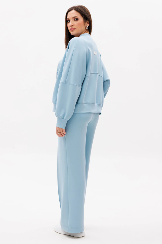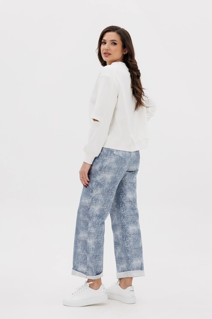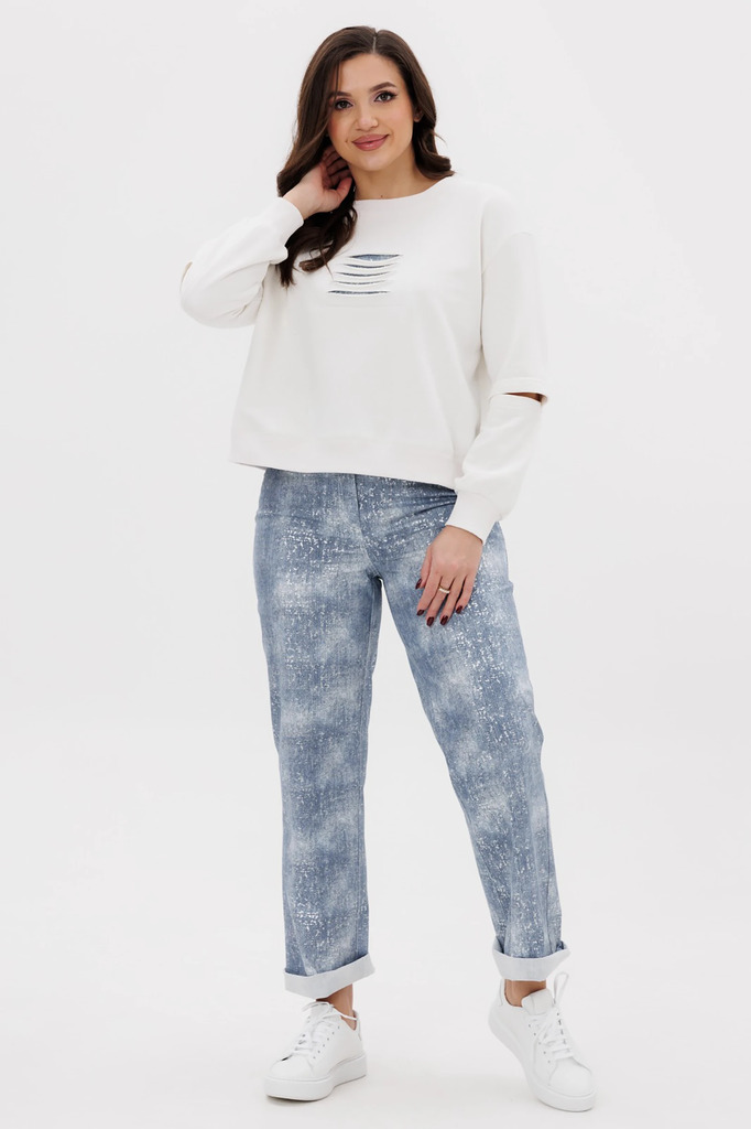 Комплект женский 2-х предметный. Свитшот свободного силуэта, с заниженной линией плеча, рукавом, расширенным в области оката, дизайнерской вставкой на полочке. Рукав двухшовный с поперечным подрезом н... Показать описаниеа передней части. Длина рукава с плечом около 74 см. Джинсы высокой посадки с серебристым напылением с классическими 5-ю карманами. Задние половинки с отрезными кокетками и вытачкой от бокового шва. Длина брюк около 105 см Джемпер: ПЭ-27%; Хлопок-70%; Эластан-3%; Брюки: Спандекс-4%; Хлопок-96%