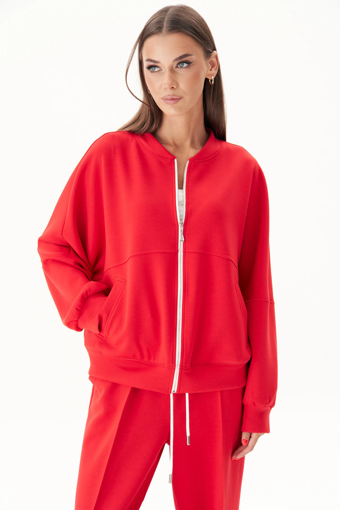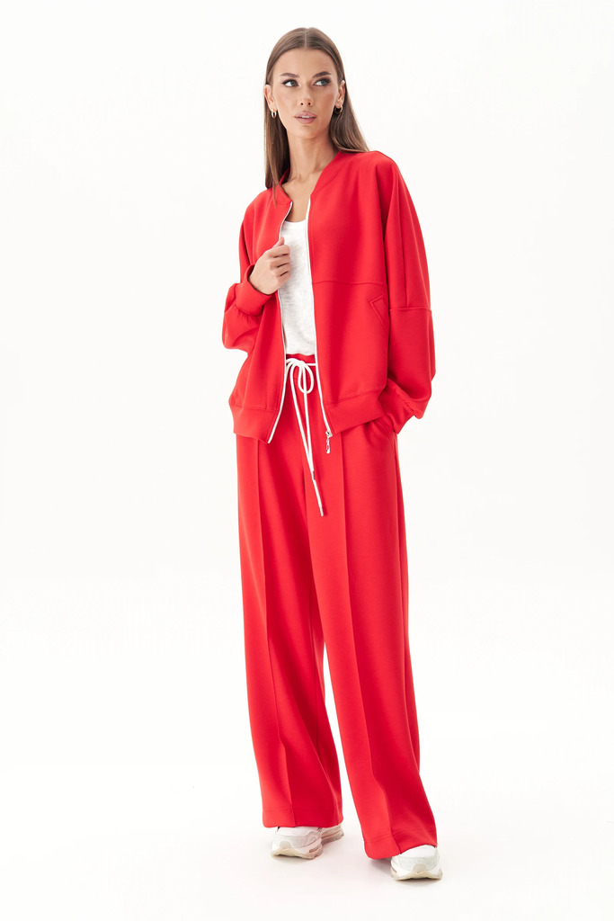 Спортивный костюм сегодня - это не только одежда для спорта. гардероба любой современной девушки - он является ещё и элементом стиля.Спортивный костюм в ярко-красном цвете будет уместен везде и всегда... Показать описание, несмотря на любые веяния моды.Костюм состоит из свободной лёгкой куртки на разъёмной тесьме-молнии и прямых брюк.Цельнокроеный покрой актуален, он идеально обеспечивает свободу движений. Воротник в виде мягкой стойки, по переду спинки и рукавам - акцентные рельефы, подчёркнутые отделочными строчками. Для удобства использования - прорезные карманы с листочками.Низ куртки и рукавов - на притачных манжетах.Брюки свободные, с вертикальными защипами-стрелками на передних половинках визуально удлиняют и стройнят. Предусмотрены боковые карманы. Пояс брюк с эластичной лентой и регулировкой на шнур спереди.Фурнитура - металлическая тесьма, эмблема на спинке, текстильный шнур.Длина изделия по спинке-около 58 см.Длина рукава от шва притачивания воротника с плечом - около 72 см.Длина брюк около 106 см. пэ 72%, вискоза 12%, нейлон 10%, спандекс 6%.