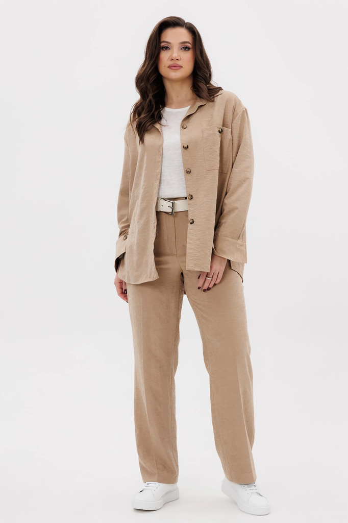 Главный тренд этого года и самый востребованный материал в жаркий сезон, конечно же лён. Модницы, которые ценят комфорт и универсальность, обязательно имеют в своем гардеробе вещи из этого уникального... Показать описание полотна. Брючный комплект всегда смотрится эффектно и дорого. Свободная, упрямлённая рубашка и брюки в расслабленном стиле. Покрой - рубашечный, воротник классический рубашечный, застёжка центральная. Спинка с отрезной кокеткой и мягкими складками. Брюки прямого силуэта, на молнии в боковом шве. В передних полотнищах брюк по переду в боковых швах вставлены детали имитирующие запах, прикрывающие высокий разрез. Брюки с поясом-завязкой по переду. 74% лен, 26% вискоза.