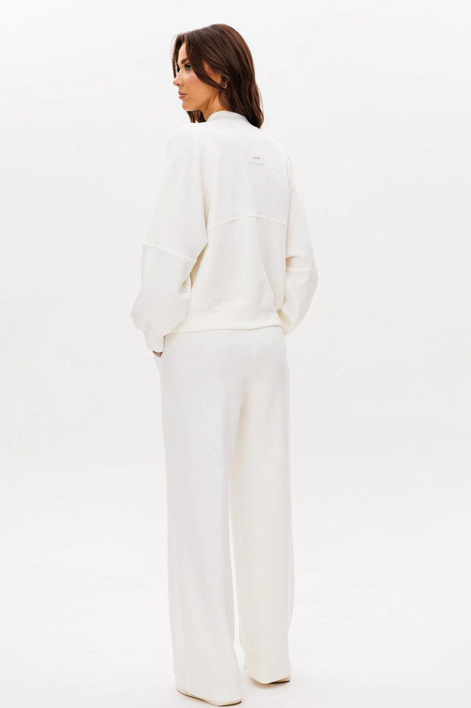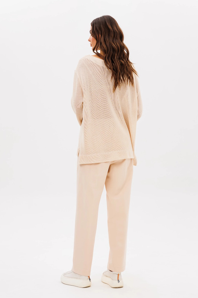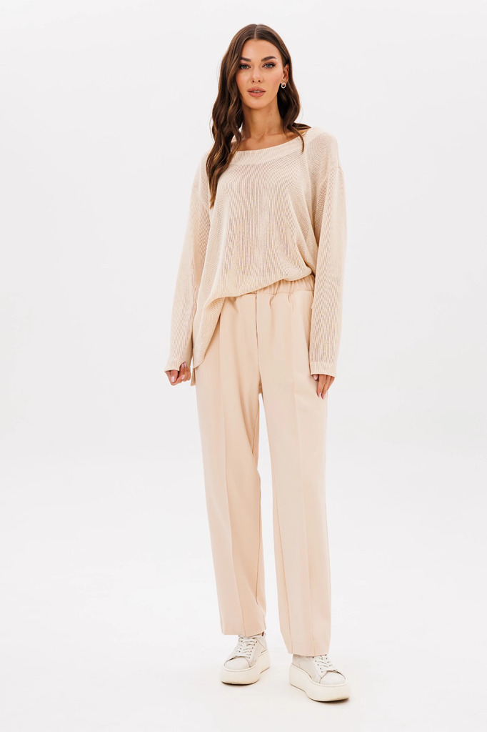 Это просто роскошный минимализм. Классика на новый манер. Одежда приближает нас к естественности и непринужденности. Спокойная палитра: В вашем распоряжении молочно-белый и теплый оттенок бежевого. Хо... Показать описаниечется быть собой, никуда не торопиться. Эта невероятная модель комплекта сохраняет равновесие в образе, хотя в ней есть и скрытая чувственность и внутренний аристократизм. Свободный упрямленный джемпер из шелковой вискозы создает ощущение прохлады, даже в жаркий день. Комфортная заниженная линия плеча и рубашечный рукав дают неограниченные возможности и свободу движения. Брюки в расслабленном стиле, на притачном эластичном поясе, с наклонными боковыми карманами и защипом по центру передних половинок, визуально удлиняющих ноги. Брюки заужены к низу, из удивительно комфортного вискозного трикотажного полотна с нейлоном, который хорошо держит форму, и совершенно не оставляет растянутости в процессе эксплуатации. Длина джемпера около 72 см. Длина рукава с плечом около 74 см. Длина брюк около 100 см. Джемпер: хлопок 45%, вискоза 55% Брюки: ПЭ 64%, вискоза 34%, спандекс 2%