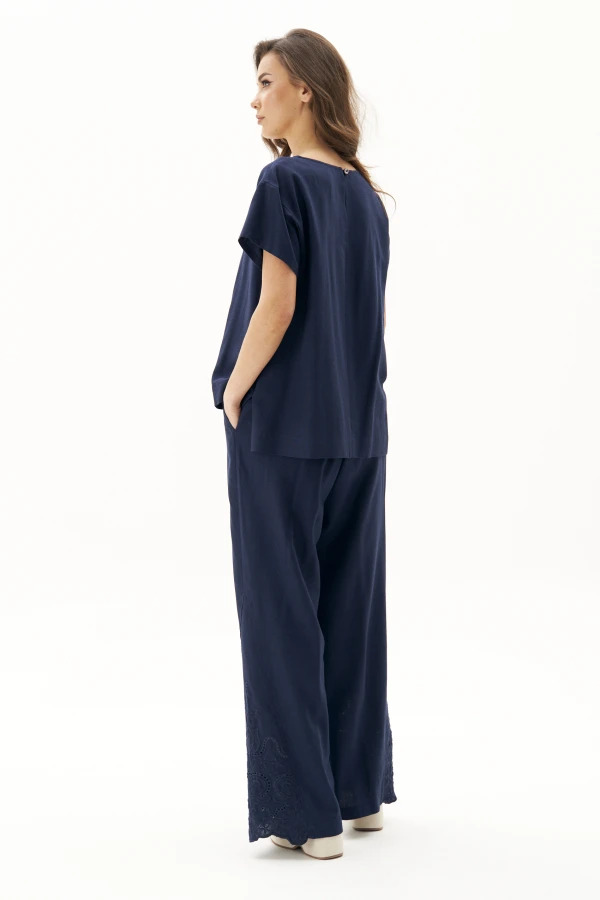 Брючный костюм из смесового льняного полотна с эффектной вышивкой. Он позволяет без усилий создать гармоничный образ, подчёркивая все ваши достоинства и минимизируя те особенности фигуры, которые вам ... Показать описаниехотелось бы скрыть.Комфортные брюки в расслабленном стиле на эластичном поясе с наклонными боковыми карманами и эффектными коническими вставками по боковому шву из вышитого полотна.Блуза свободная, покрой с заниженной линией плеча, рукав свободный, круглый вырез горловины и коническая вставка по центру переда.Спинка с центральным швом и застежкой- каплей. Низ изделия - разноуровневый.Длина брюк около 104 см.Длина блузы около 67 см.Длина рукава 12 см. 74% лен, 26% вискоза.