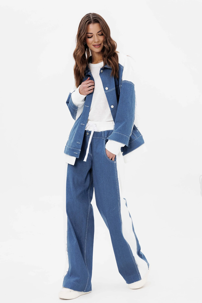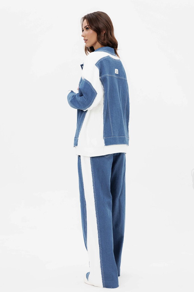 Удобство, практичность, неформальность и самодостаточность. Эти критерии, главным образом, учитывались при создании невероятного костюма в стиле спорт-кэжуал. Это по-настоящему стильное и смелое решен... Показать описаниеие: соединить трикотажный футер и джинс-в итоге, идеальная одежда для прогулок, отдыха, встреч с друзьями. Удобная куртка свободного покроя с заниженной линией плеча, рубашечным рукавом, центральной застежкой и стояче-отложным воротником. Полочка с отрезной кокеткой, вертикальными рельефами, верхним карманом с клапаном и боковым карманом, притачным поясом. Спинка с отрезной кокеткой, боковыми рельефами и притачным поясом. Рукав на притачной манжете, со вставкой из джинсовой ткани. По линии плеча, боковой части и низу-вставки из контрастного трикотажного хлопкового полотна. Брюки свободного кроя, на притачном эластичном поясе с люверсами, кулисой и декоративным шнуром. Передние половинки брюк с боковыми карманами имитацией пояса. По боковым швам-лампасы из трикотажного футера. Длина куртки около 64 см Длина рукава около 76 см. Длина брюк около 106 см хлопок 70% пэ 27% эластан 3%