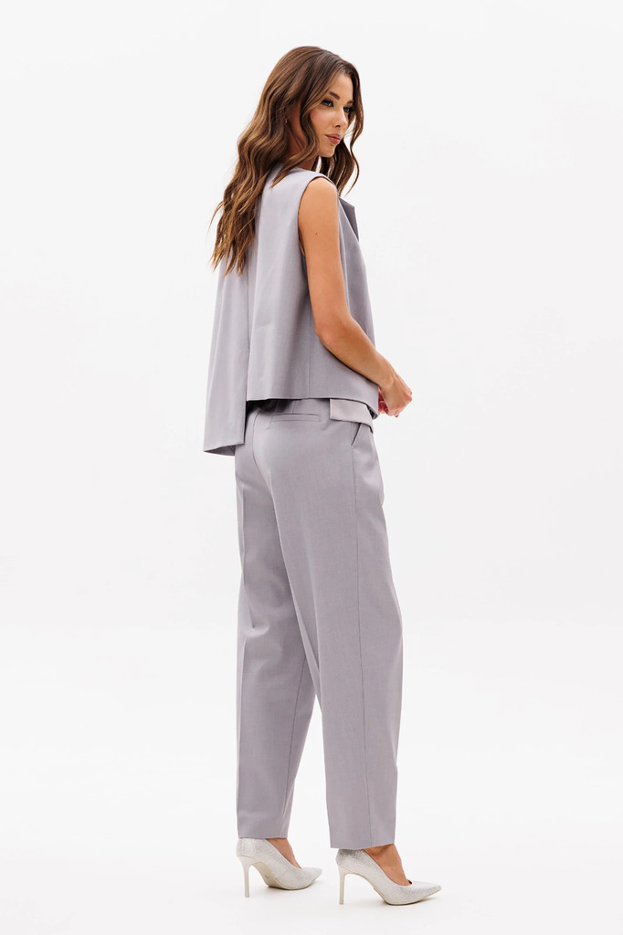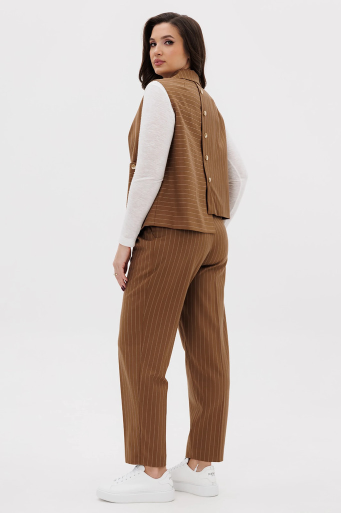 Костюм с жилетом - прекрасное решение для смелых экспериментов. Выполненный в актуальной цветовой гамме, он позволяет дополнять себя различными аксессуарами и создавать каждый раз новые актуальные обр... Показать описаниеазы. Жилет прямого силуэта с центральной застёжкой и фигурным разноуровневым бортом. Спинка с декоративной разноуровневой планкой, которая имитирует застежку. Брюки классического покроя с высокой посадкой на притачном поясе со шлёвками, зауженные. Застежка брючная на потайной крючок и молнию. Передние половинки брюк с мягкими складками-защипами и наклонными боковыми карманами. Задние половинки брюк с вытачками и прорезными карманами с листочками. Длина брюк около 100 см. пэ 64%, вискоза 34%, спандекс 2%