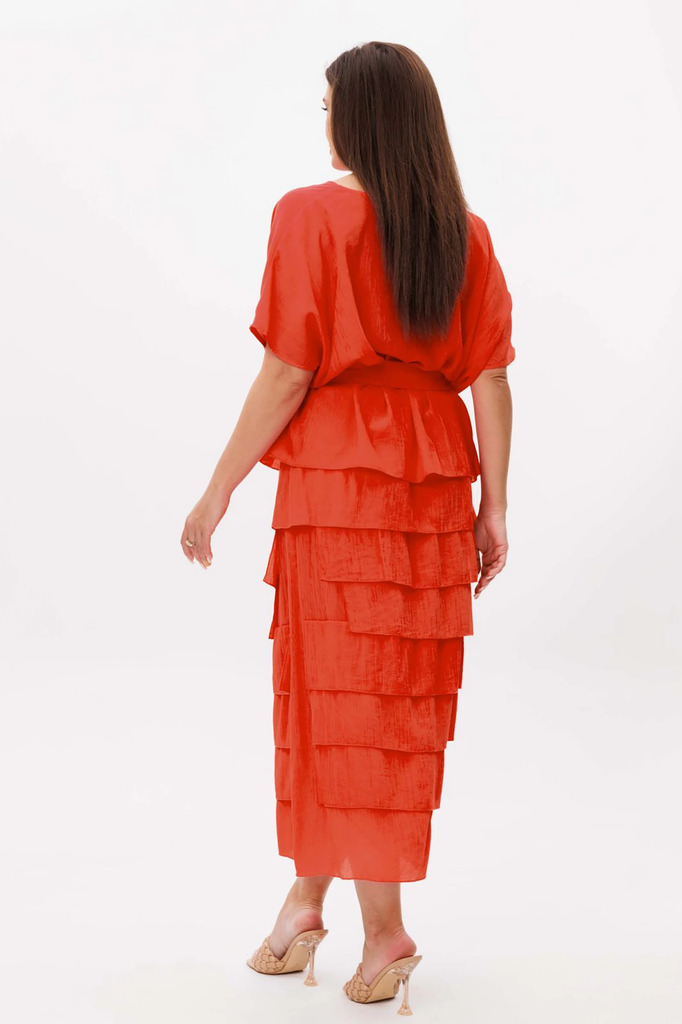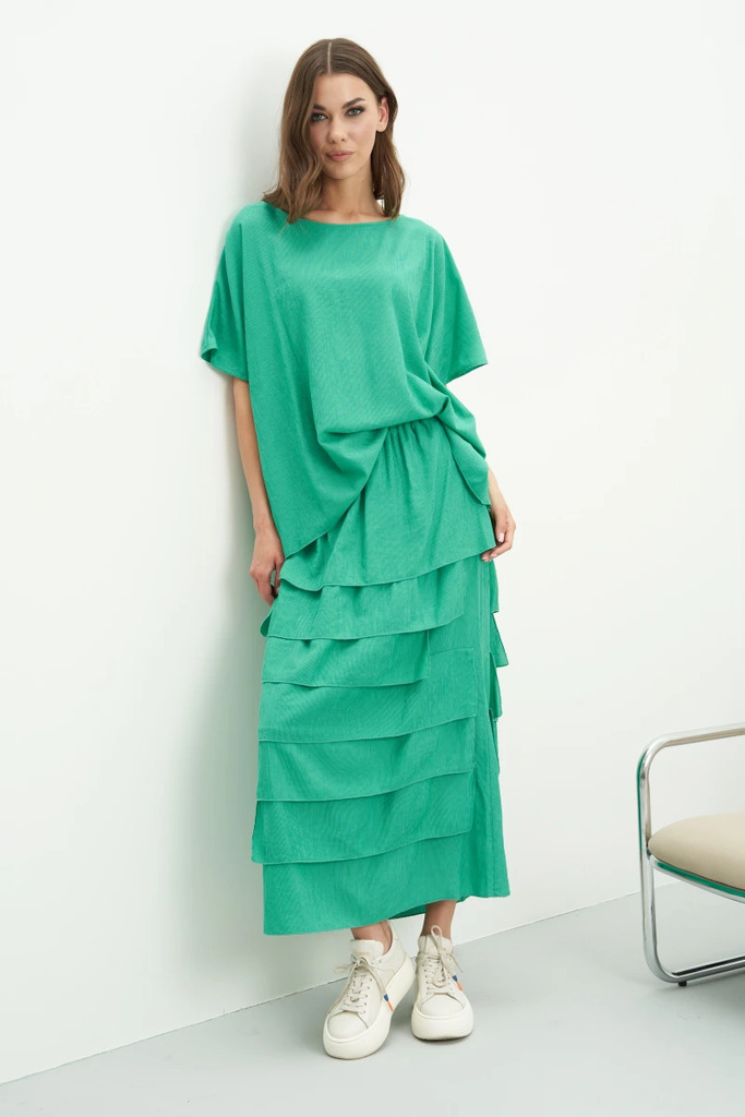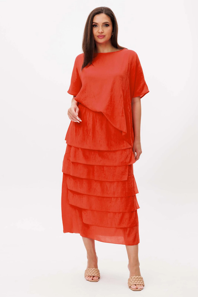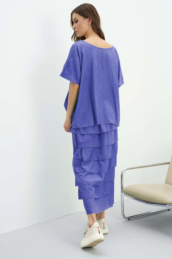 Казалось бы, лучшая одежда для тёплого лета - это платье, сшитое из лёгкой ткани, однако, по сравнению с платьем или сарафаном, комплект имеет преимущества, которые сложно оспорить. Во-первых, хорошая... Показать описание комбинаторность. Вы легко можете сочетать вещи комплекта с другими предметами гардероба - футболками, брюками, топами. Во-вторых, комплект умело скрывает недостатки телосложения, при этом подчёркивает женственность, являясь более практичной одеждой. Комплект состоит из свободной бузы и юбки. Блуза с расширенной линией горловины цельнокроенного покроя с коротким рукавом, широкая по форме с прямой линией низа. Юбка на широком притачном поясе с удобной эластичной лентой внутри и застёжкой на потайную тесьму - молнию сбоку. И поскольку многослойность сейчас в тренде - переднее с заднее полотнище юбки выполнено в виде настрочных асимметричных воланов без сборки - что даёт нужный правильный эффект без оптического увеличения объёмов. Комплект дополнен широким мягким поясом, который по Вашему желанию подчеркнёт линию талии. Длина блузы по спинке около 56 см, длина юбки около 89 см. вискоза 87%, пэ 13%.