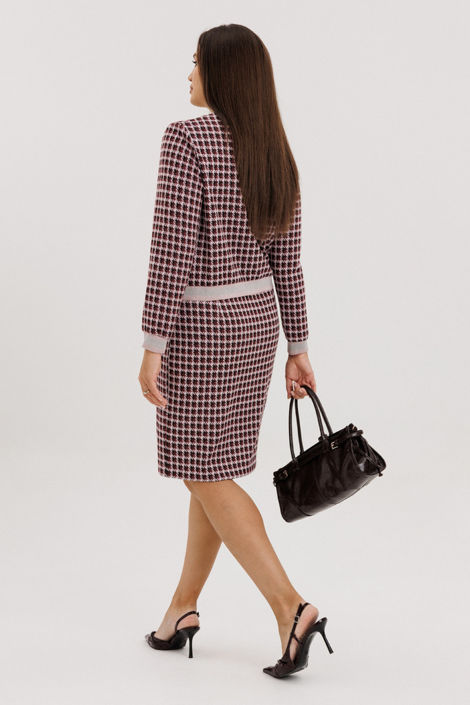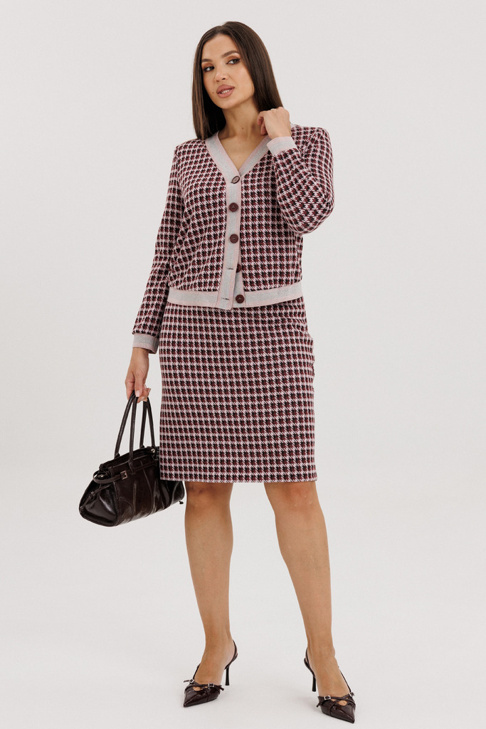 Костюм трикотажный бордо с белым довязомТрикотажный костюм с юбкой… Это лучший способ создать свой оригинальный стиль. Ведь его можно носить соло, а можно сочетать с модными в этом сезоне кожаными брю... Показать описаниеками или трендовыми кюлотами. А все потому, что он состоит из уютного укороченного кардигана и прямой удлиненной юбки. Простота в сочетании со стилем. Свободный силуэт, расширенная линия плеча, втачной рукав, центральная застежка. Горловина низки рукавов и низ изделия из трикотажного довяза. Юбка удлиненная, на эластичном поясе. Длина кардигана около 54см. Длина рукава с плечом около 72 см. Длина юбки около 70 см вискоза 87%, пэ 13%.