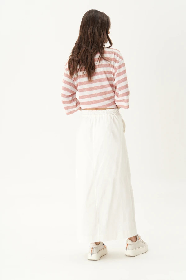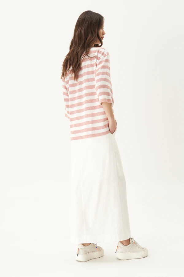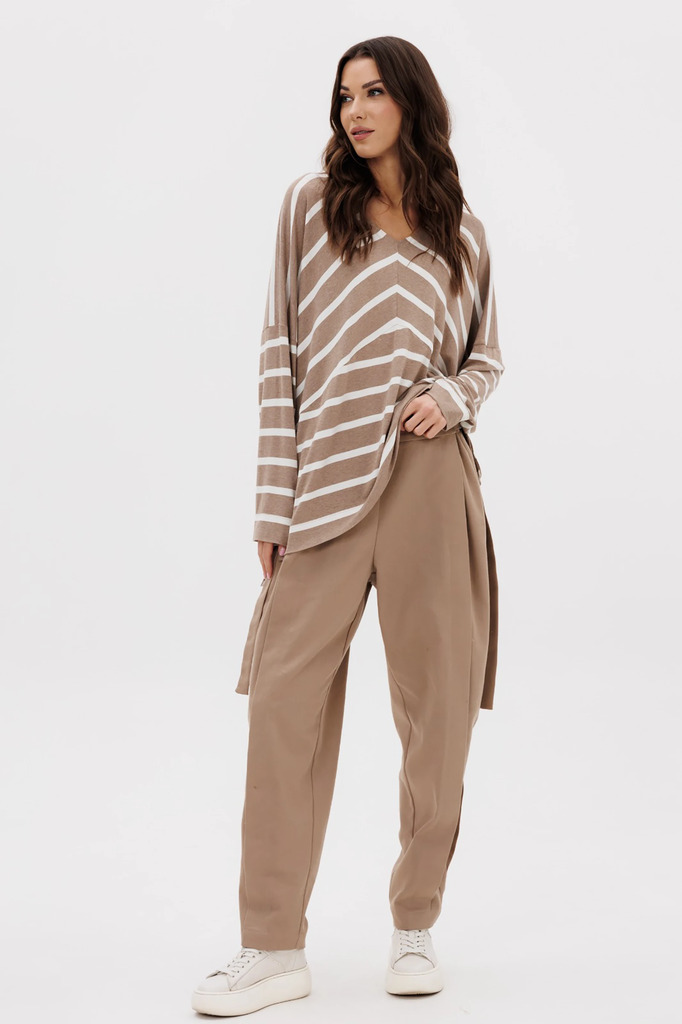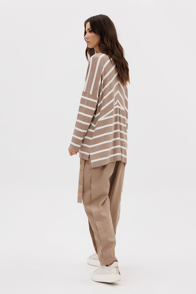 Этот брючный комплект-максимум стиля и практичности. Его легко можно "разобрать" на составные части и сочетать с другими вещами. Он акцентирует внимание на вашей индивидуальности и делает комфорт прио... Показать описаниеритетам! Свободный упрямленный джемпер в полоску из трикотажа и супер трендовые брюки из хлопкового габардина. Джемпер упрямленный, с заниженной линией плеча, боковыми разрезами и разноуровневым низом. Брюки в расслабленном стиле, сложного покроя с притачным поясом по центральным передним и задним половинкам и цельнокроеных эластичным поясом по бочкам. Без застежки, с мягкими застроченными складками по переду и спинке, слегка зауженные к низу. Линия талия регулируется притачным поясом с полукольцами. Длина джемпера около 77см. Длина рукава с плечом около 74 см. Длина брюк около 102 см. Джемпер: хлопок 96%, спандекс 4% Брюки: хлопок 63%, ПЭ 37%.