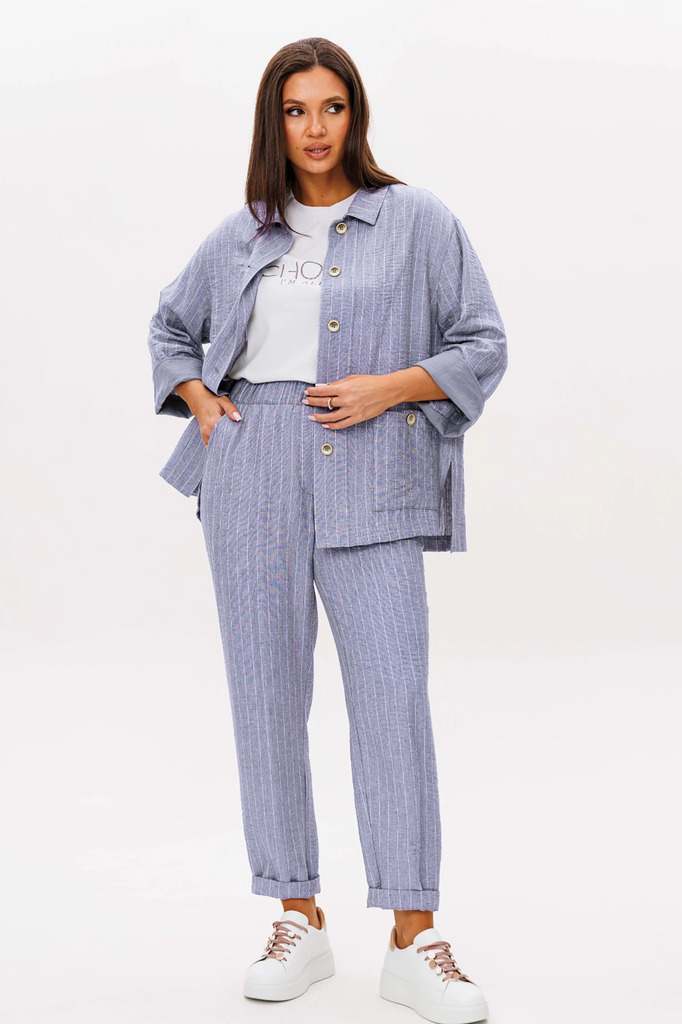 Однозначный фаворит всех модниц - костюм из льна: выглядит по летнему свежо, легко сочетается с обувью и аксессуарами, не создает эффекта излишней праздничности и официальности. идеальным решением для... Показать описание лета станет наш брючный комплект со свободными расслабленными брюками и жакетом-рубашкой. Брюки слегка зауженные к низу, на притачном эластичном поясе с наклонными боковыми карманами. Жакет свободного упрямленного силуэта, рубашечного покроя с центральной застежкой, рубашечным рукавом и воротником, разноуровневым низом. Полочка с накладным нижним карманом. Спинка с отрезной кокеткой и легкой бантовой складкой. Рукав с отложной манжетой, по боковым швам разрезы. Длина жакета около 80 см. Длина рукава с плечом около 74 см. Длина брюк около 102 см. вискоза 70%, лен 30%