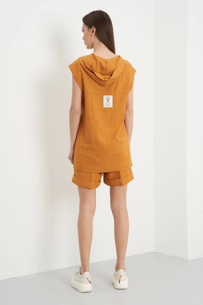 Практичный и удобный льняной комплект - лучший вариант для летней жары и тёплого солнца. Комплект двухпредметный состоит из удлинённой туники без рукавов и шорт на резинке. Туника прямого силуэта со с... Показать описаниепущенной линией плеча и проймой, переходящей в подрез треугольной формы. Перед лифа состоит из двух частей: горизонтальной кокетки с цельнокроенным капюшоном и нижней частью. Застёжка на тесьму-молнию в центральном шве переда. Спинка состоит из двух частей: горизонтальной кокетки и нижней части. Спинка чуть длиннее переда и разрезами по боковым швам. В качестве отделки-декоративная нашивка на спинке. Шорты свободной формы на притачном поясе с эластичной тесьмой. Пояс с декоративным шнуром и двумя люверсами, позволяющий фиксировать шорты на любой талии. Карманы наклонные, в боковых швах. Низ шорт с отложной манжетой. Длина туники по среднему шву спинки около 74 см. Длина штор по боку около 40 см. хлопок 55%, лен 45%.