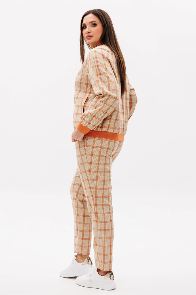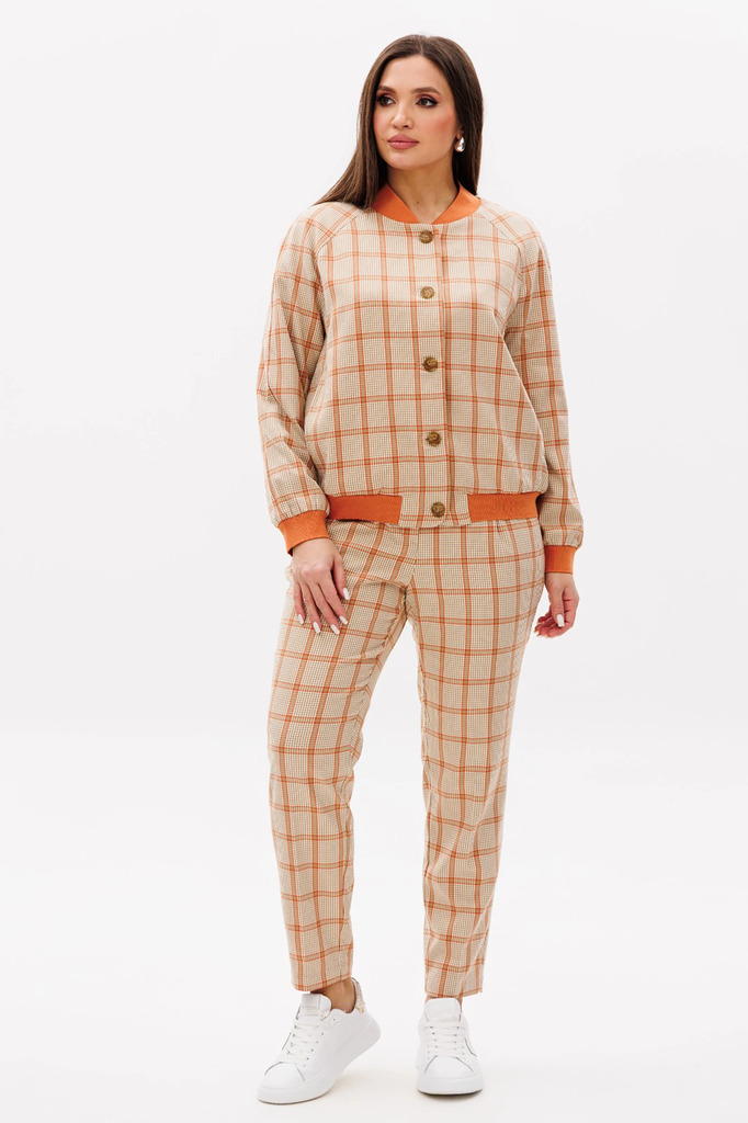 Тэнсол, принц Уэльский, тартан, гусиная лапка. Эти стильные принты помогут выделиться из толпы тем, кто не любит яркие детали. Костюм из такой ткани смотрится выигрышно сам по себе и не требует дополн... Показать описаниеительных акцентов. Для активных и современных девушек мы предлагаем в весеннем сезоне не стандартный вариант брючного костюма, а смелое сочетание трендовой ткани и спортивного стиля: классические брюки +спортивный бомбер. Согласитесь это смотрится великолепно! Свободный силуэт, покрой реглан, застежка центральная, воротник, манжеты рукавов и низ изделия из отделочной тесьмы-довяза. Полочка с боковым рельефом и карманом. Брюки классического покроя с отрезным поясом (эластичным в области спинки),ж наклонными боковыми карманами и мягкими складками на передних половинках.Длина жакета около 60 см. Длина рукава с плечом около 74 см. Длина брюк около 102 см. пэ 64%, вискоза 34%, спандекс 2%.