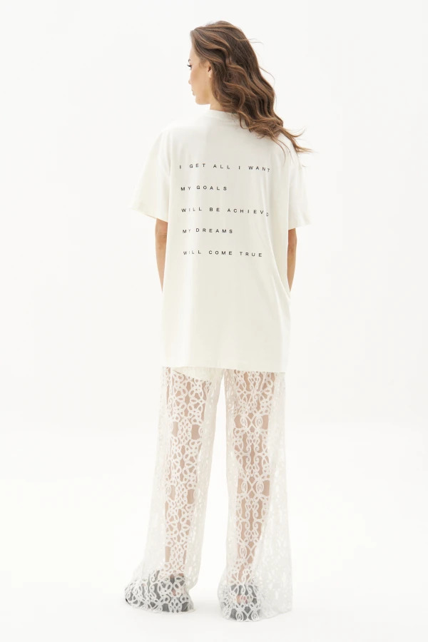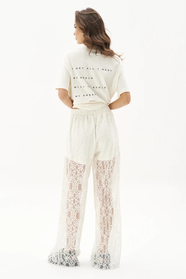Мода лета 2024 представляет прозрачные ткани, как один из ключевых трендов сезона.Платья из таких полотен уже давно не в новинку, но в этом сезоне к ним мы добавили другую вариацию женской одежды : не... Показать описаниевероятный брючный комплект, который, развеваясь шикарными складками, создаёт у окружающих иллюзию подглядывания.Свободная футболка и гипюровые брюки с эластичными шортами внутри.Футболка широкая, удлинённая, с дизайнерским принтом и заниженной линией плеча.Брюки в свободном, расслабленном стиле, на притачном эластичном поясе и с подкладкой шортами из хб трикотажного полотна.Длина брюк около 105см.