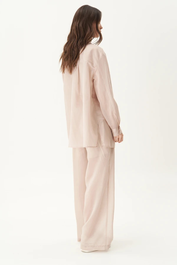 Мода лета 2024 представляет прозрачные ткани, как один из ключевых трендов сезона.Платья из таких полотен уже давно не в новинку, но в этом сезоне к ним мы добавили другую вариацию женской одежды : не... Показать описаниевероятный брючный комплект, который, развеваясь шикарными складками, создаёт у окружающих иллюзию подглядывания.Свободная, невесомая рубашка, майка-топ и прозрачные брюки с эластичными шортами внутри.Рубашка оверсайз-силуэта, рубашечного покроя с центральной застёжкой, рубашечным воротником со стойкой и рубашечным рукавом на притачной на притачной манжете. Полочка с декоративным подрезом и двухслойной вставкой. Спинка с отрезной кокеткой и мягкой складкой. По боковым швам - разрезы.Брюки в свободном, расслабленном стиле, на притачном эластичном поясе и с подкладкой шортами из хб трикотажного полотна.Майка-топ их хб трикотажного полотна с эффектным вырезом, на притачном поясе с декоративным элементом.Длина рубашки около 78 см.Длина рукава с плечом около 74 см.Длина брюк около 105 см. рубашка и брюки - тенсель 90%, пэ 10% топ - хлопок 96%, спандекс 4%.