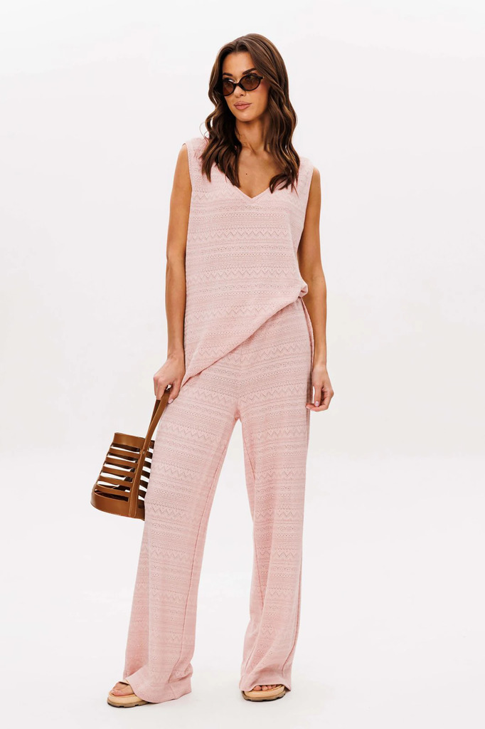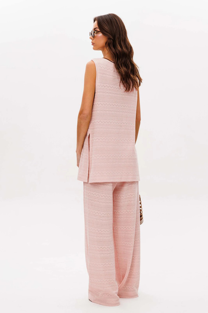Есть очевидные причины, почему мы так любим трикотажные изделия: -они пластичны, легко принимают форму и ложатся по фигуре -приятны на ощупь -обладают великолепной терморегуляцией -не мнутся -не сковы... Показать описаниевают движения, в них уютно и комфортно -и наконец, это очень красиво! Поэтому, когда наступает долгожданный теплый сезон, вопроса, что мы будем носить, не возникает. Конечно же, практичный, модный, стильный и комфортный брючный комплект из ажурного х/б трикотажа. Туника свободная, без рукава, с V-образным вырезом и высокими боковыми разрезами. Брюки прямые, свободные, на эластичном поясе. Длина туники около 74см. Длина брюк около 104 см. 100% хлопок