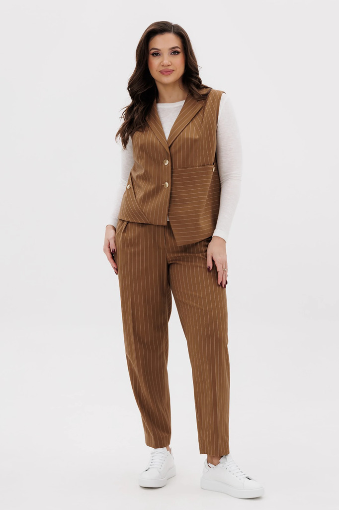 Костюм с жилетом - прекрасное решение для смелых экспериментов. Жилет полуприлегающего силуэта с асимметричной застёжкой, фигурной линией низа и регулирующийся кулисе по спинке. Полочки с отрезным бо... Показать описаниечком и нагрудными вытачками, спинки - с центральным швом, отрезным бочком и регулирующийся кулисой с фиксаторами. Брюки "баррел" на притачном поясе со шлёвками (эластичном в области спинки), с наклонными карманами , мягкими складками защипами по верху брюк и вытачками по низу. Джемпер трикотажный, с длинным рукавом, полуприлегающего силуэта. хлопок 65% пэ 35%