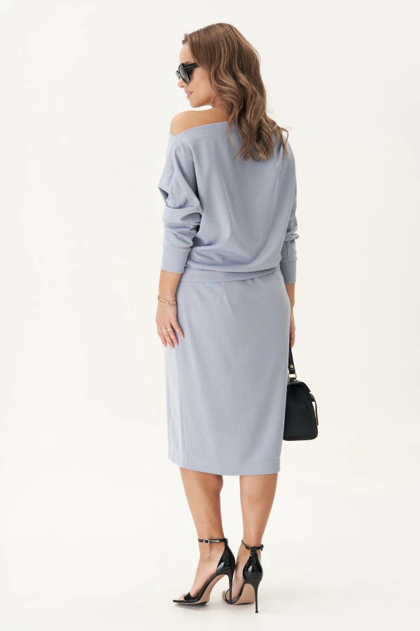 Модный гардероб современной женщины очень разнообразен. Составить интересный, оригинальный и неповторимый образ не так уж и просто. И здесь, на выручку нам приходит модный трикотаж, ведь кроме того, ч... Показать описанието это максимально удобно и практично, это еще и невероятно красиво. Великолепная двойка, состоящая из прямой юбки длины миди и свободного джемпера с частично цельнокроенным рукавом. Силуэт свободный, линия горловины – лодочка, на правом плече мягкая складка, рукав, зауженный к низу. Юбка на отрезном поясе с эластичной тесьмой, отделочными люверсами и шнуромДлина джемпера около 57см. Длина рукава с плечом около 72см. Длина юбки около 68см ПЭ 64%, вискоза 34%, спандекс 2%