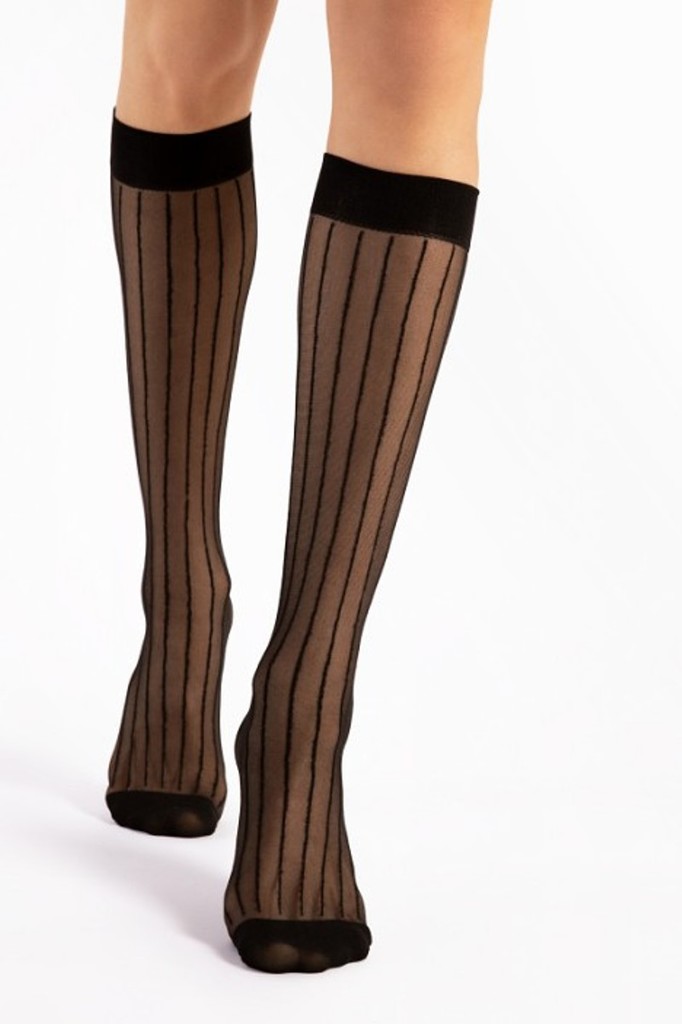 Шелковистые матовые гольфы LINEA 15 DEN с геометрической полоской. Усиление на пальцах. Комфортная резинка не пережимает ногу. Их можно сочетать во многих классических образах.