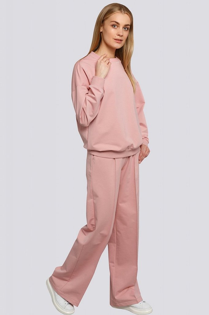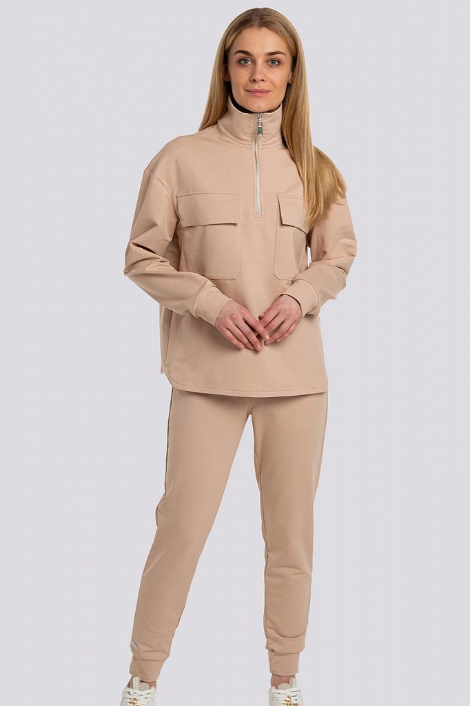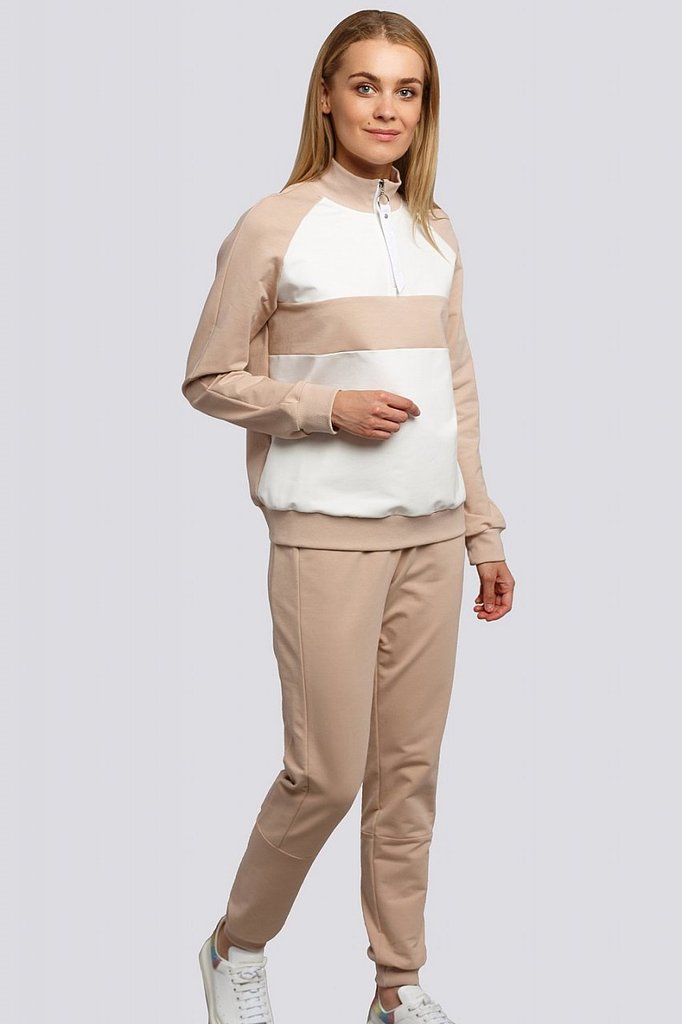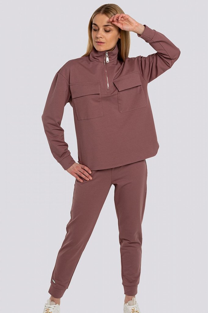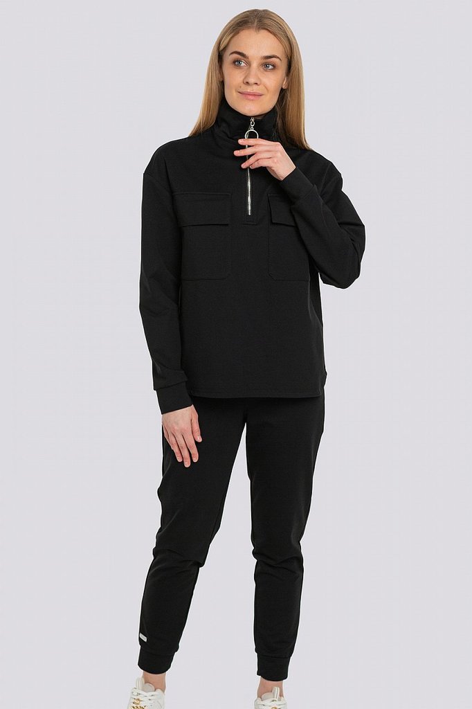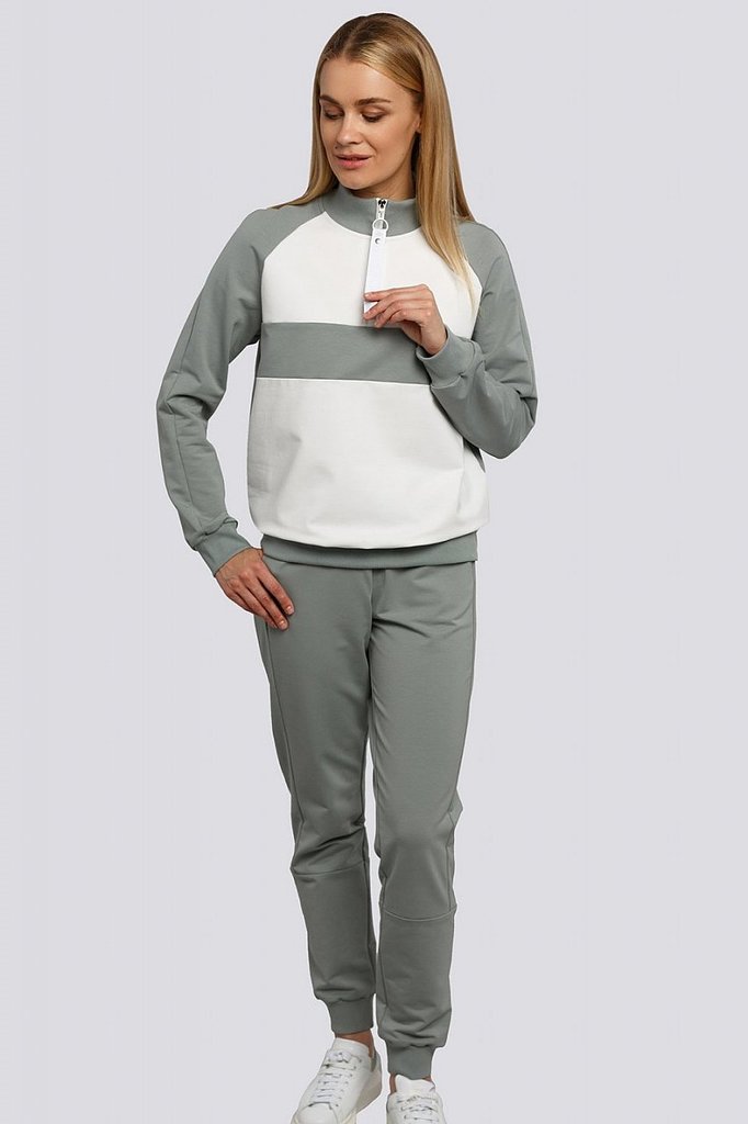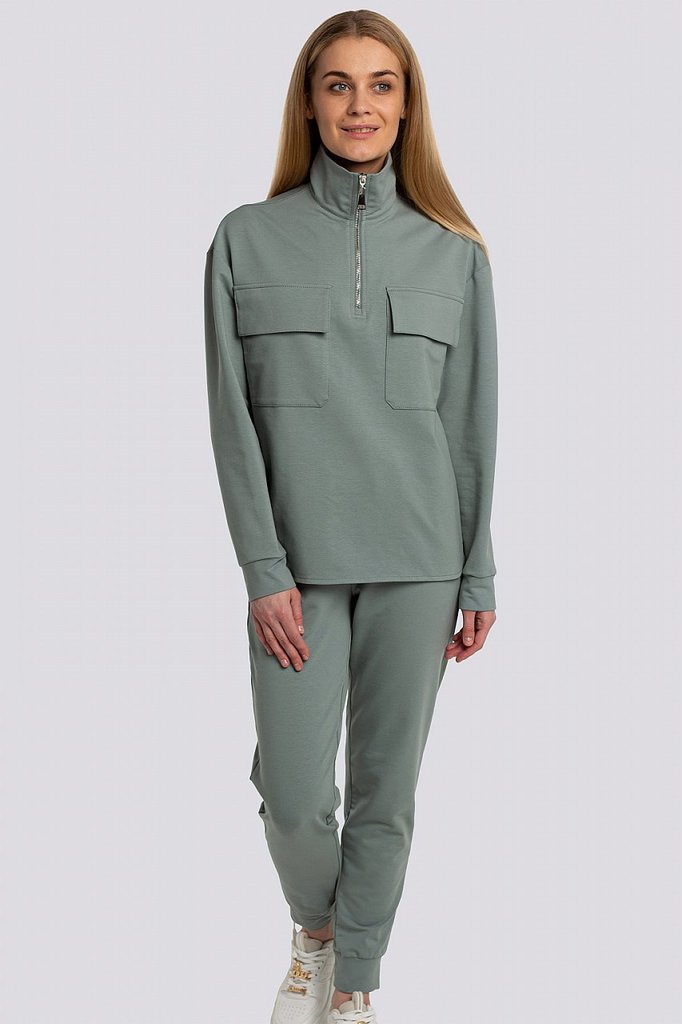 Cтиль спорт шик утвердился в списке самых популярных трендов и с тех пор не покидает пьедестал. Женский костюм в стиле спорт шик сочетает в себе привлекательность, выразительность и высокий уровень ко... Показать описаниемфорта. Локаничный, свободный свитшот с металлической молнией до уровня груди и воротником стойкой. На груди два накладных кармана с клапанами. Низ слегка выгнутой формы. Брюки среднего объёма, без лишних деталей, пояс на резинке, по низу манжеты. Состав трикотажа: 75% хлопок, 20% полиэстер, 5% спандекс.