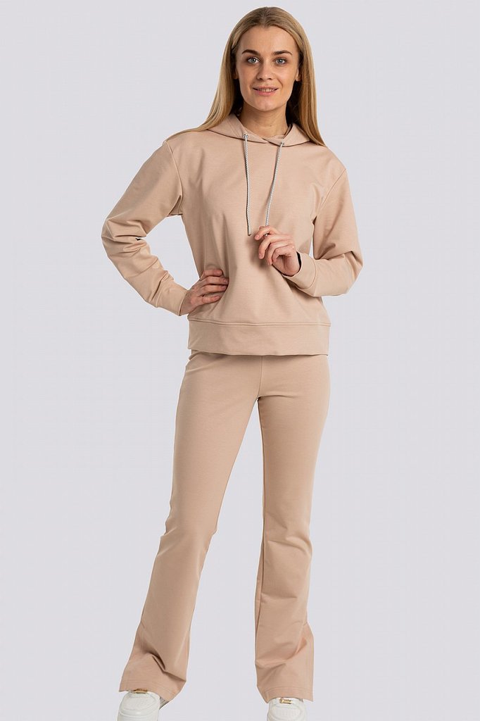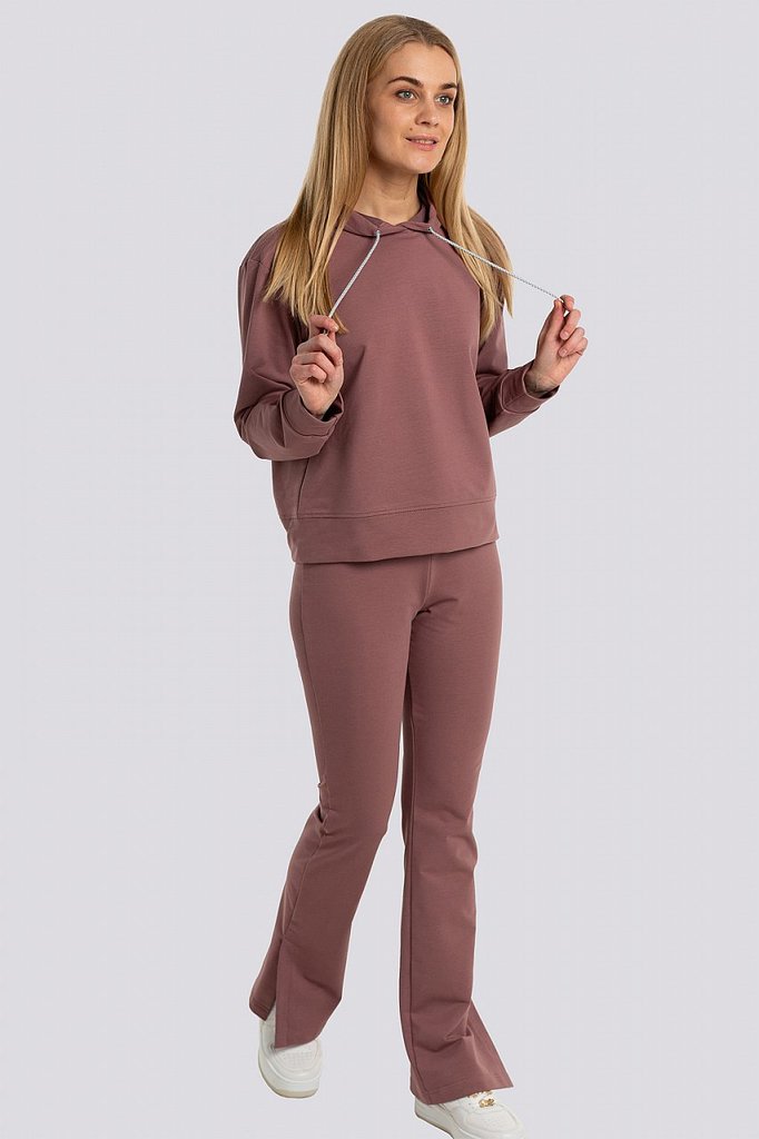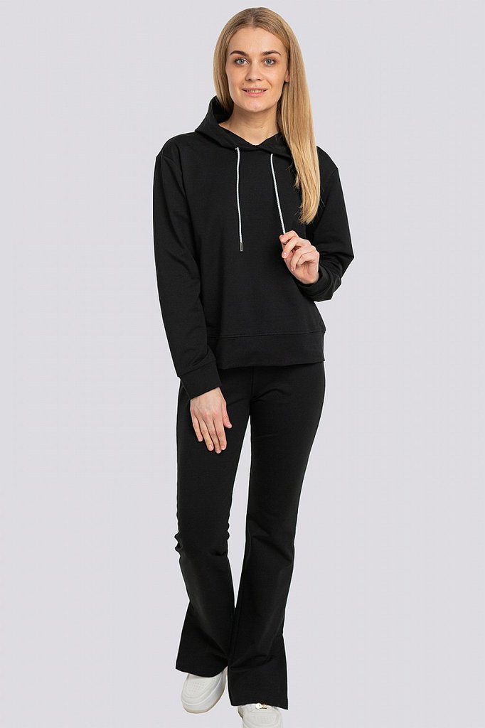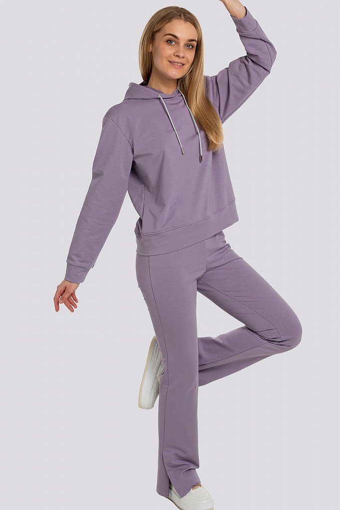 Универсальный вариант на каждый день – модный трикотажный костюм с брюками. В комплекте трендовая укороченная толстовка и стильные брюки клеш. Толстовка с капюшоном, низ изделия и низ рукава обработан... Показать описаниеы поясом и манжетами. В капюшон вставлен светоотражающий шнур. Брюки-клеш с поясом на резинке. По бокам брюк шлицы. Состав трикотажа: 75% хлопок, 20% полиэстер, 5% спандекс.