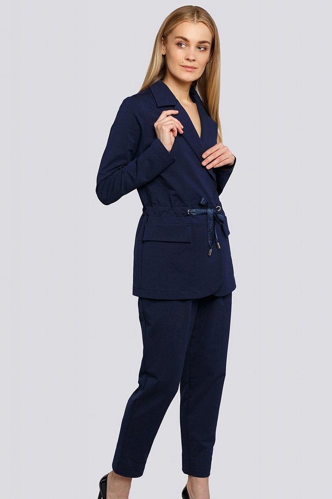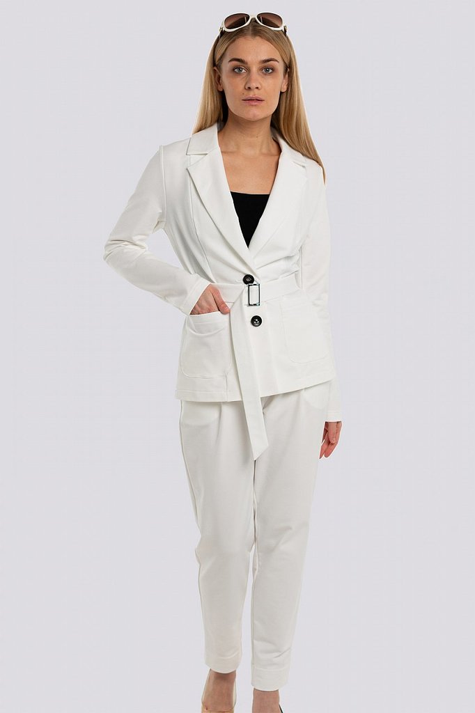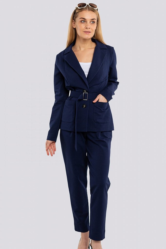 Стильный брючный трикотажный костюм – отличный вариант деловой одежды. Жакет приталенного силуэта с английским воротником и застежкой на пуговицы. На переде накладные карманы. Талию подчеркивает пояс ... Показать описаниена пряжке. Брюки с высокой посадкой и складками на талии. Пояс на резинке. По низу брюк можно отвернуть манжеты. 75% хлопок, 20% полиэстер, 5% спандекс.