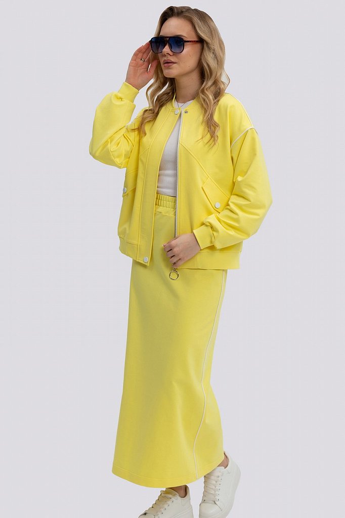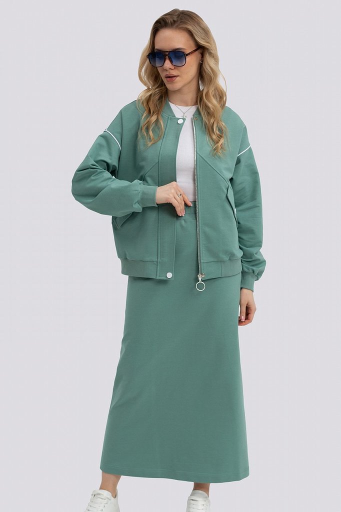 Отличный вариант классического костюма для повседневной носки. Соответствующая цветовая гамма трикотажа делают такой костюм очень комфортным в носке. Жакет с отложным воротником, приталенного силуэта,... Показать описание застежка на 2 пуговицы. Юбка-карандаш элегантной длины, пояс на широкой резинке 5 см. Состав трикотажа: 75% хлопок, 20% полиэстер, 5% спандекс.