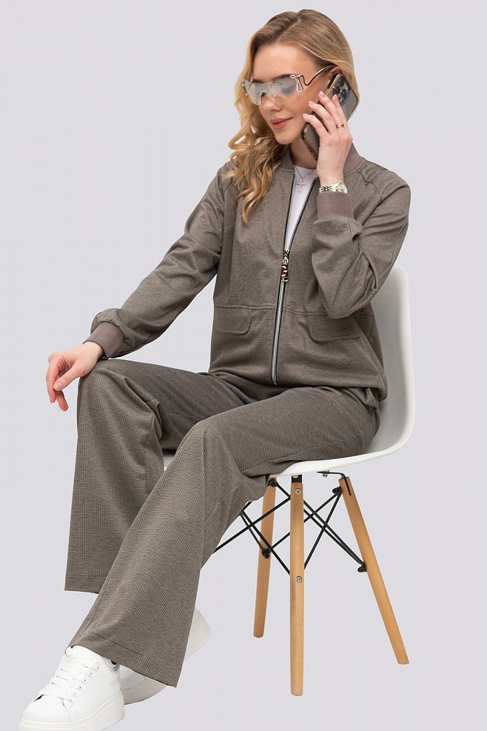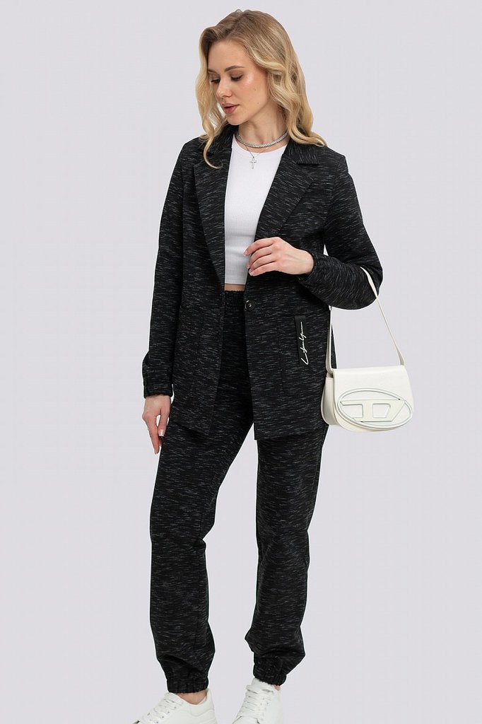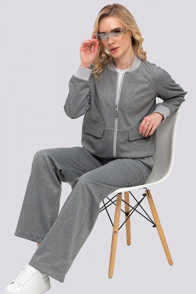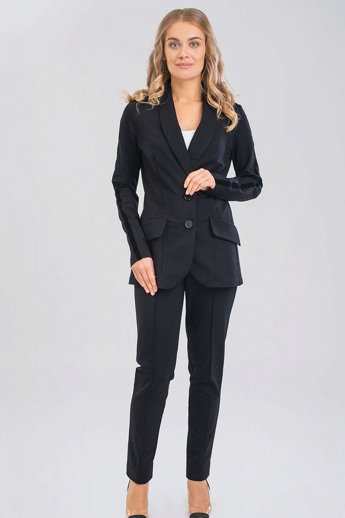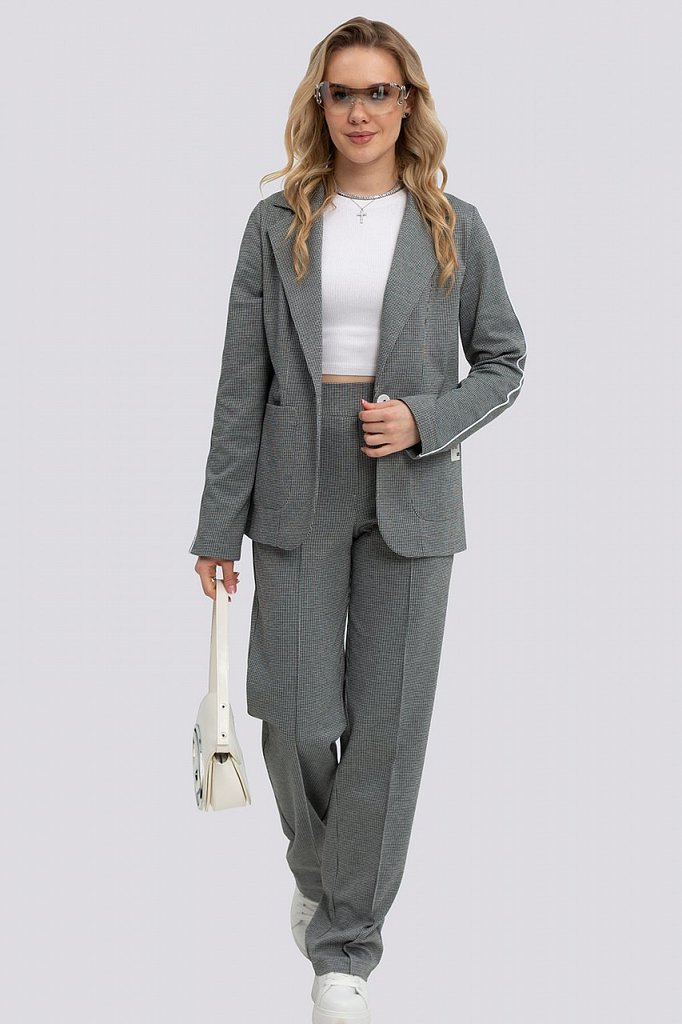 Классический женский костюм есть у каждой модницы. Но теперь они стали гораздо удобнее и практичнее в носке, т.к. шьются из трикотажных тканей. Таким образом подобный костюм мы можем использовать как ... Показать описаниев качестве делового, так и повседневного. Брюки классического кроя, со стрелками, пояс частично на резинке. Воротник пиджачного типа придает образу элегантности, строгости. Но все же жакет с легким намеком на спорт – белый кант по рукаву, белая фурнитура освежают дизайн, придают дерзости образу. Накладные карманы добавляют уют. Цветовая гамма разнообразна, новинка – расцветка серая «лапка» - очень универсальна и отлично сочетается с любым цветом. Состав трикотажа: 75% хлопок, 20% полиэстер, 5% спандекс.