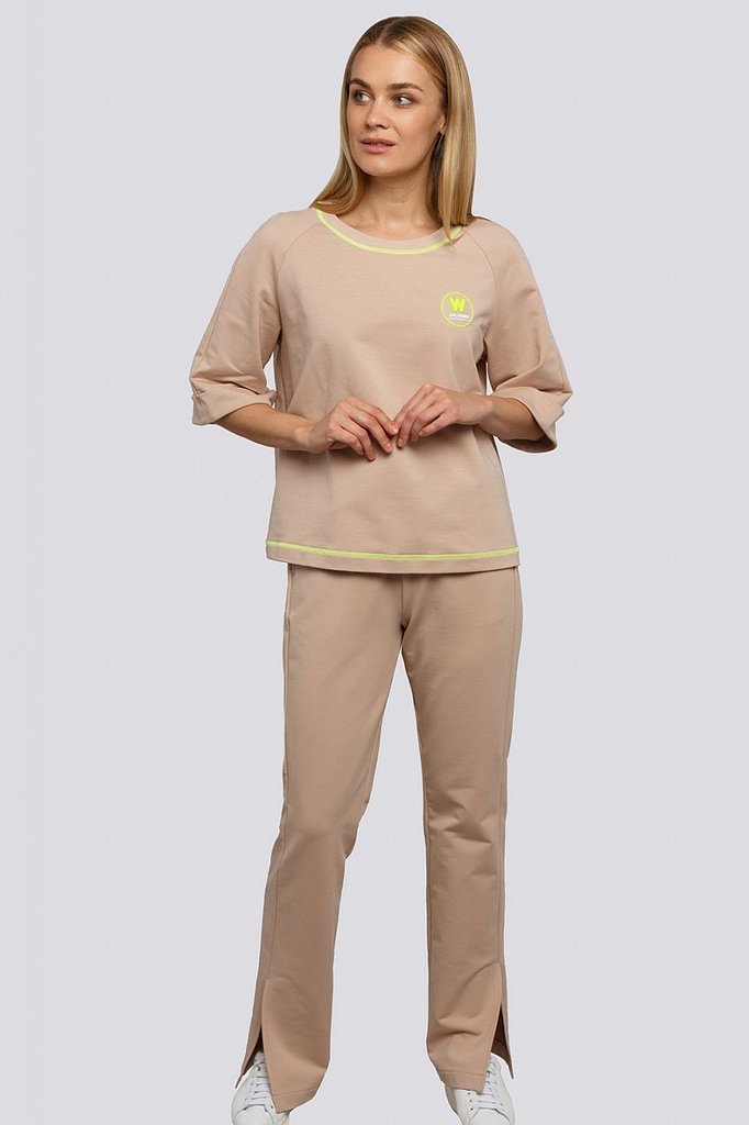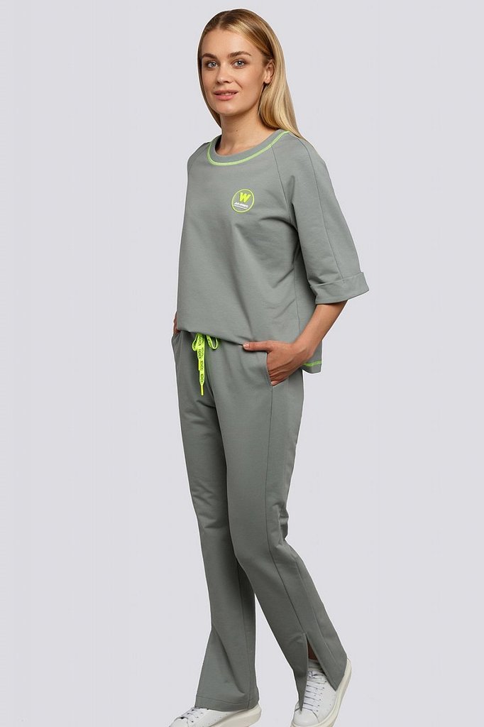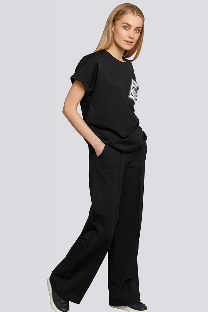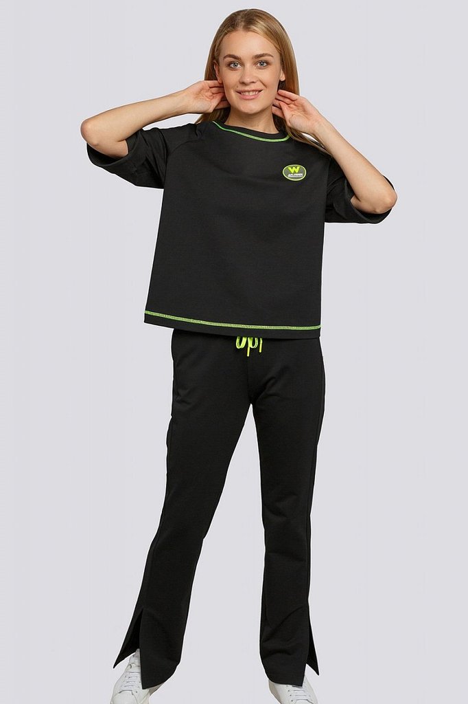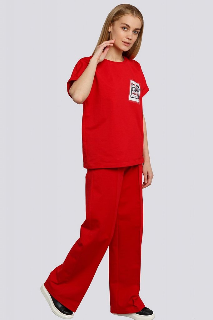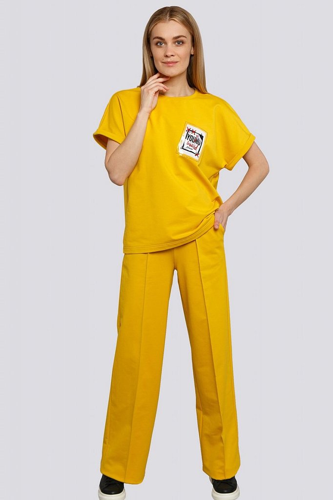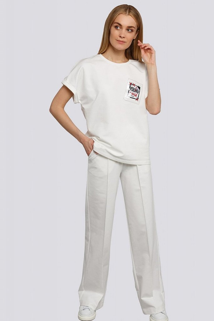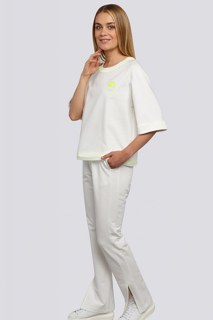 Стильный и изысканный костюм, состоящий из свободных брюк и футболки. Брюки свободные, по низу, с боков разрезы. По верху на резинке. Кармашки в шве. Футболка свободная, с рукавом до локтя, украшена я... Показать описаниеркой эмблемой и строчками на изделии салатного цвета. Состав трикотажа: 75% хлопок, 20% полиэстер, 5% спандекс.