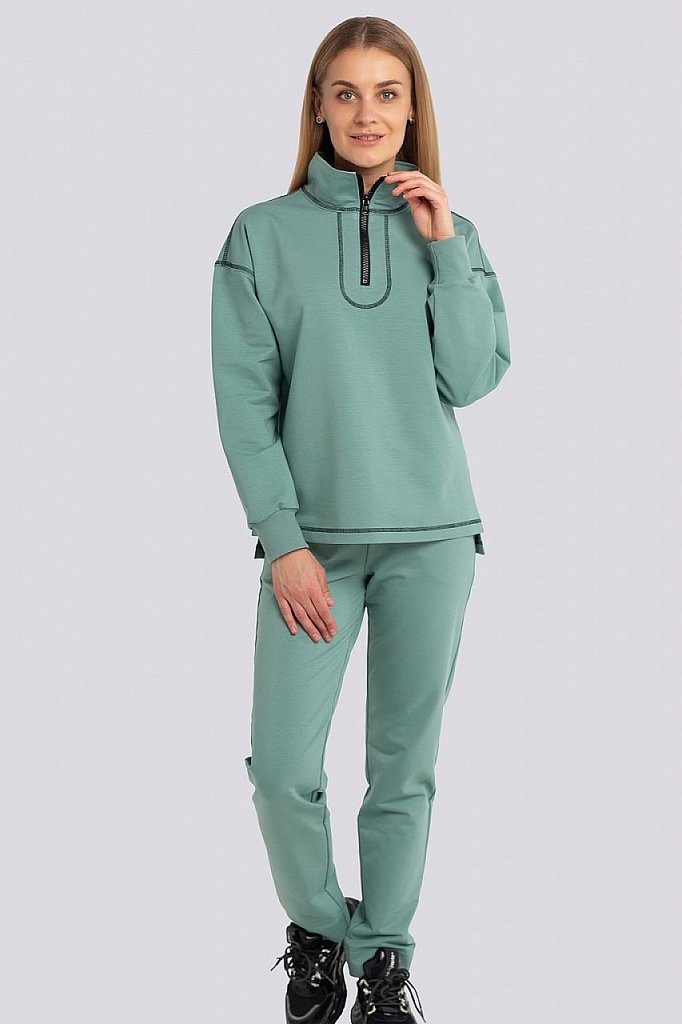 Cтиль спорт шик утвердился в списке самых популярных трендов и с тех пор не покидает пьедестал. Женский костюм в стиле спорт шик сочетает в себе привлекательность, выразительность и высокий уровень ко... Показать описаниемфорта. Локаничный, свободный свитшот с металлической молнией до уровня груди и воротником стойкой. На груди два накладных кармана с клапанами. Низ слегка выгнутой формы. Брюки среднего объёма, без лишних деталей, пояс на резинке, по низу манжеты. Состав трикотажа: 75% хлопок, 20% полиэстер, 5% спандекс.
