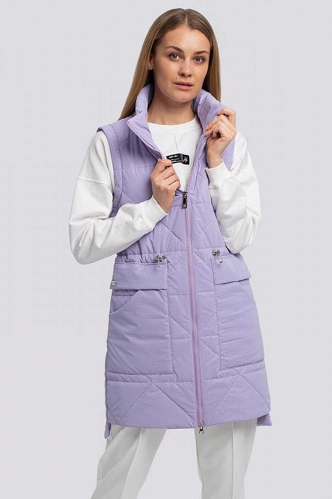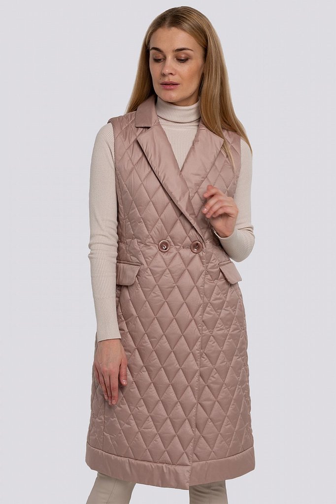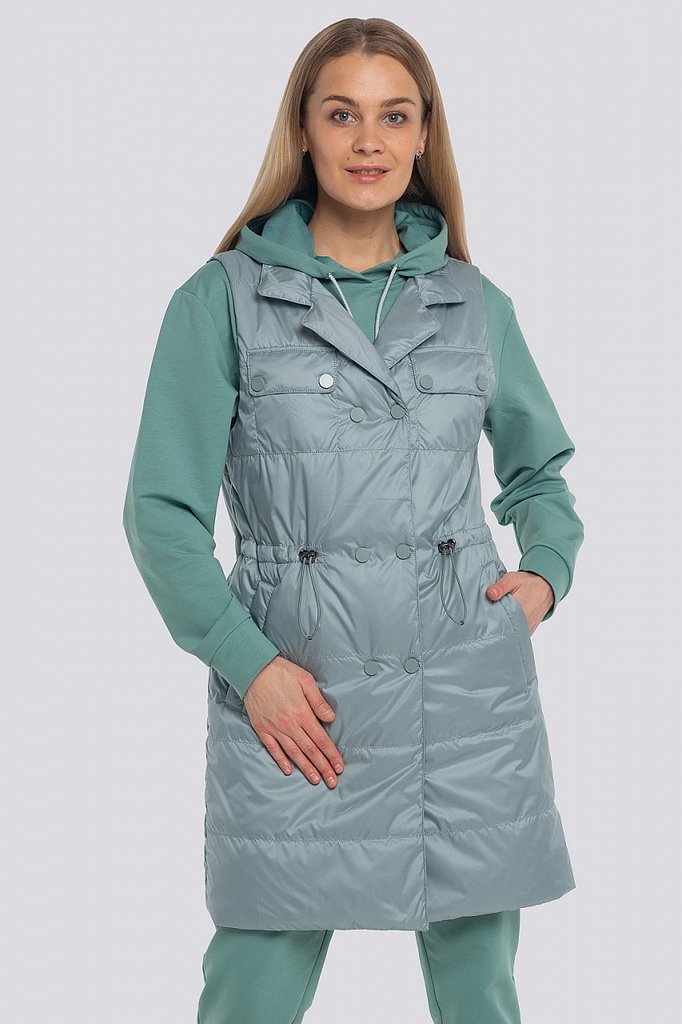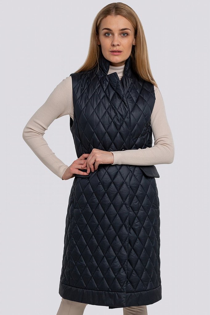 Теплые женские жилеты — не новый тренд, тем не менее его популярность усилилась, благодаря универсальности, практичности этой одежды среди других фасонов. Удлиненный жилет из стеганой ткани смотрится ... Показать описаниестильно и будет согревать вас в холодную погоду. Жилет прямого силуэта с английским воротником. Застежка двубортная на петли и пуговицы. Спереди карманы в швах и декоративные клапаны. На спинке – декоративный пояс на пуговицах. «Изюминку» в модель вносит сочетание стеганой ткани и деталей из гладкой ткани. Утеплитель термофин, плотность 100.