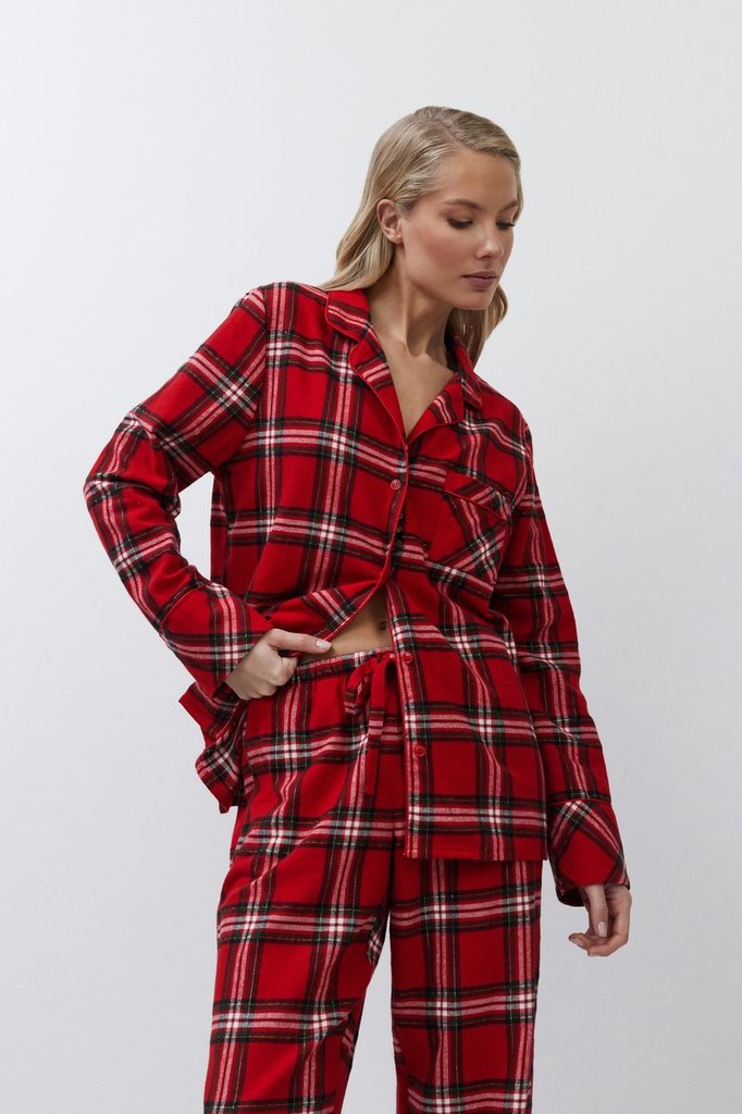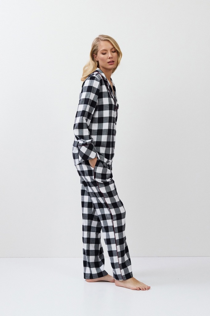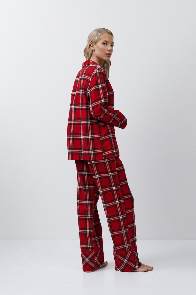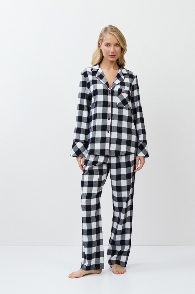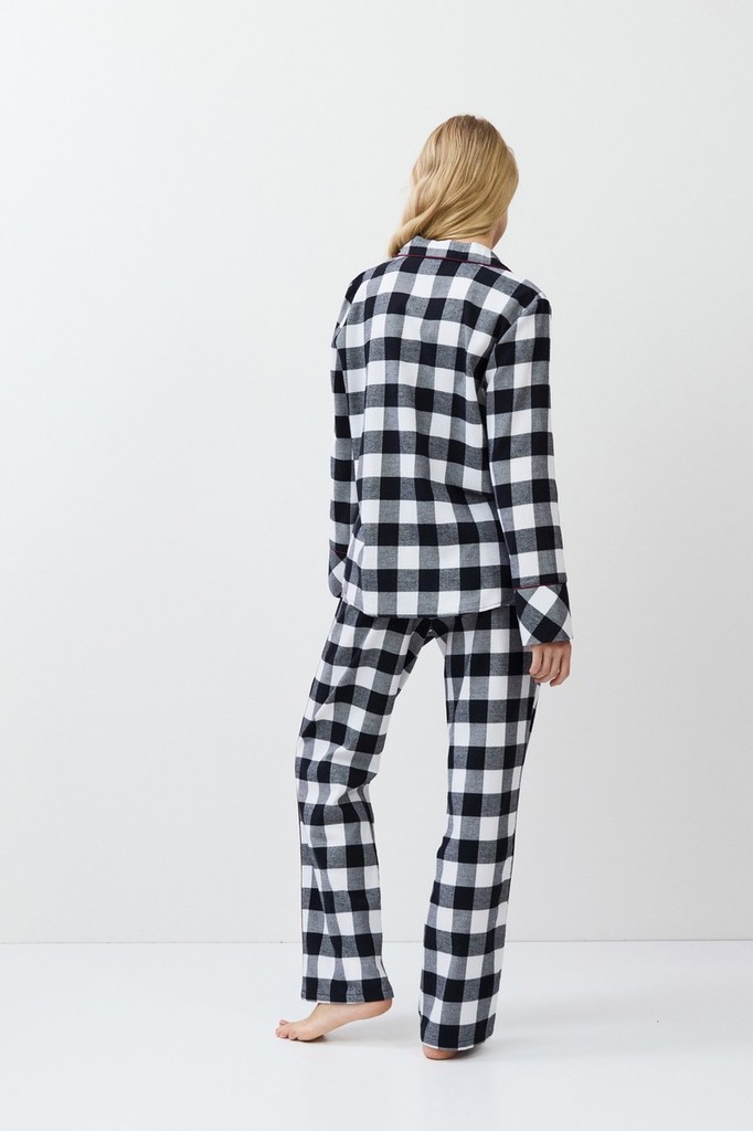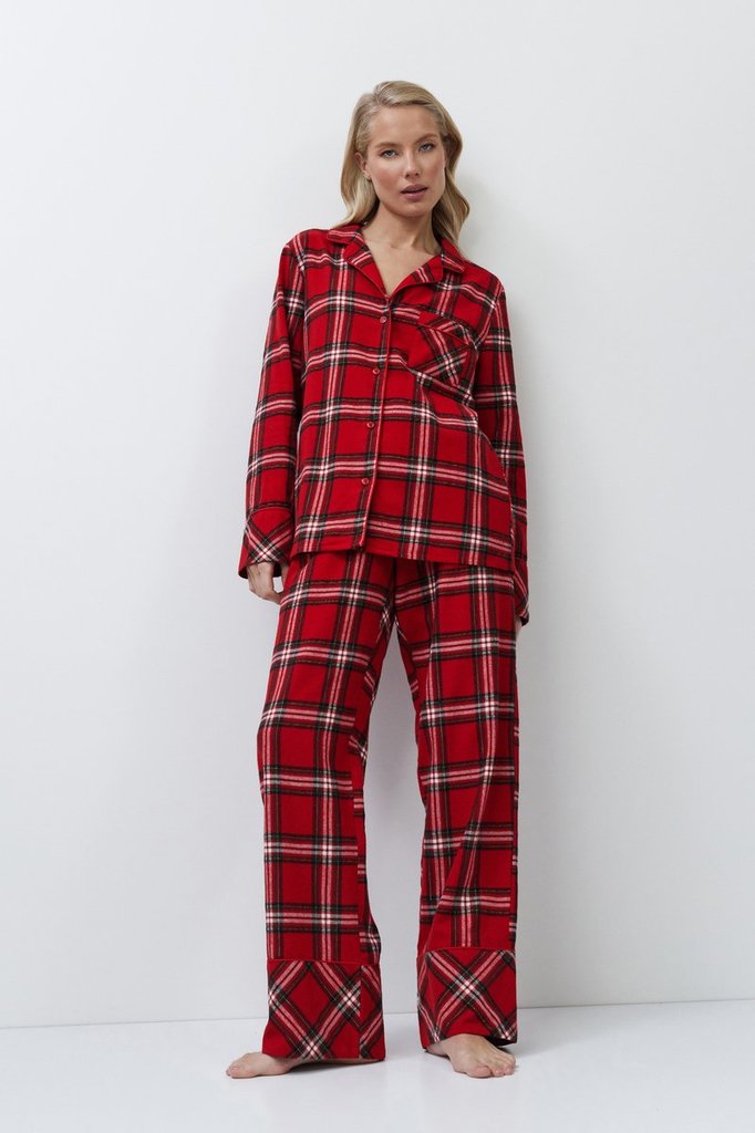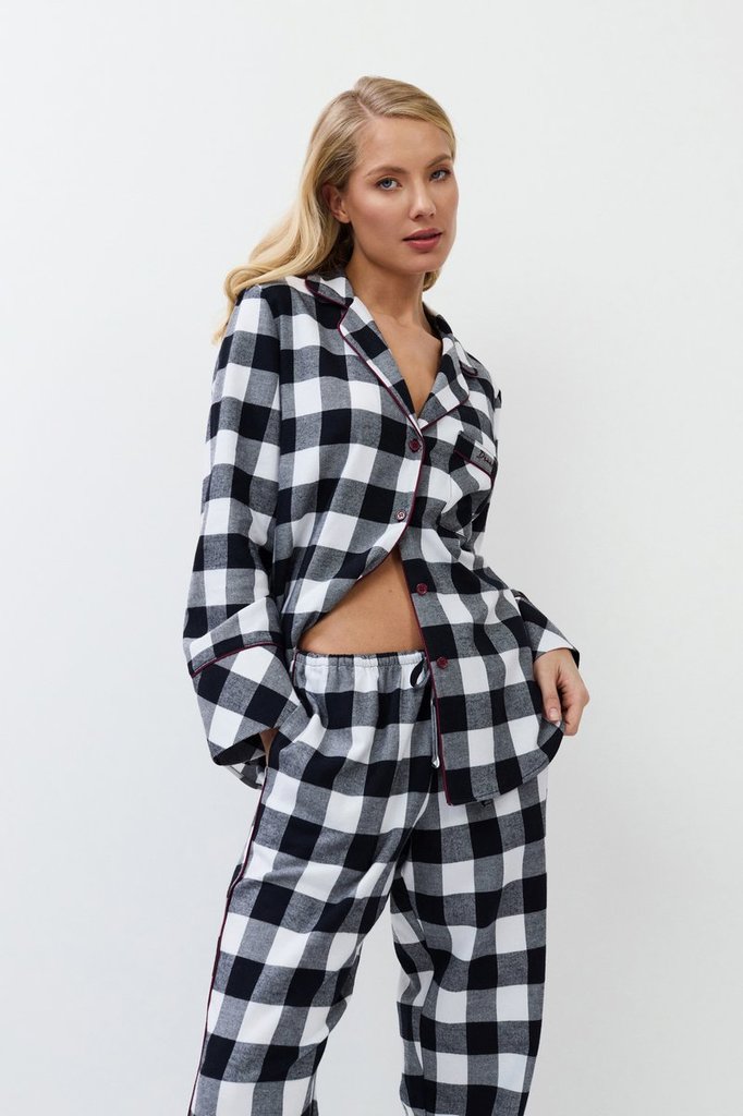 Пижама женская со штанами BELL для вашего ночного комфорта. Пижама выполнена из хлопковой фланели с добавлением люрексовой нити. Рубашка на пуговицах, с длинными рукавами, отложным воротником и нагруд... Показать описаниеным карманом. Окантовка дополняет и украшает комплект. Штаны длинные, свободной формы, с эластичным поясом с завязкой и боковыми и задним карманами. Расслабьтесь с максимальным комфортом и стилем в пижаме BELL.