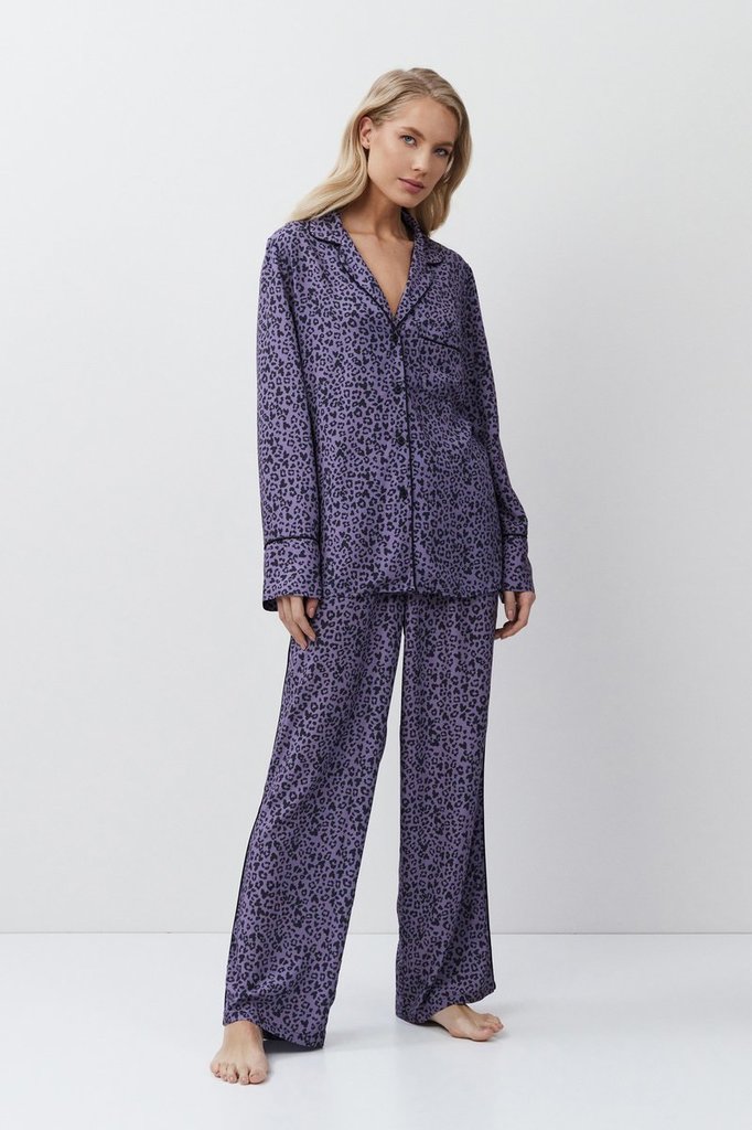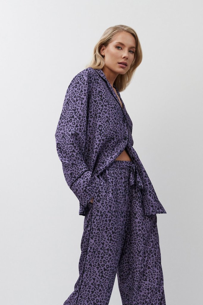 Представляем вашему вниманию длинную пижаму Beatrich — воплощение безумной мечты. Изготовлена из лёгкой вискозы с шикарным серым леопардовым принтом. Рубашка на пуговицах с короткими рукавами, манжета... Показать описаниеми и V-образным вырезом. В сочетании с брюками в тон с обычным поясом, украшенным коричневой лентой и боковыми манжетами, этот комплект излучает необузданное очарование. Дайте волю своему воображению в нашей длинной пижаме Beatrich, которая идеально подойдёт тем, кто не боится мечтать.