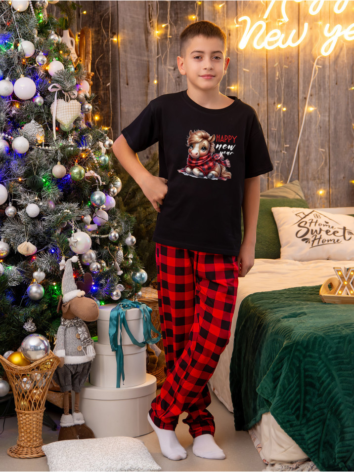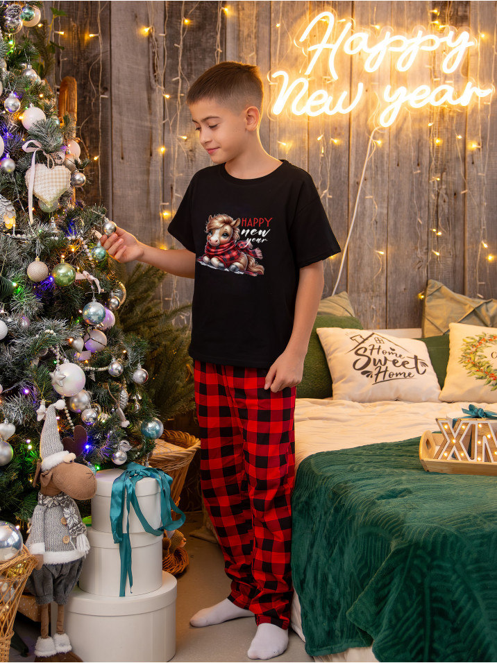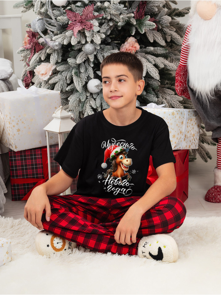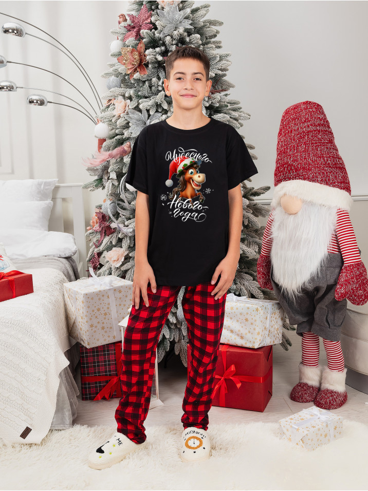 Краткое описание Хотите подарить вашему маленькому принцу или уже выросшему юному джентльмену стильный комплект для уютных домашних вечеров? Мы представляем вам нашу детскую пижаму со штанами для маль... Показать описаниечиков из высококачественной трикотажной хлопковой ткани. Этот комфортный и яркий набор, состоящий из футболки с интересным принтом и штанов в модной клетку, понравится как самым маленьким модникам, так и уже подросткам. Особенностью этой пижамы является уникальный принт, на котором изображен символ - талисман грядущего года. Такой костюм прекрасно подойдет для новогодней семейной фотосессии в стиле "фэмили-лук". И самое интересное, у нас есть такие же рисунки на женских пижамах! Таким образом, вы сможете создать настоящий праздничный "Family look". Наша пижама не только стильная, но и функциональная. Она не будет слишком теплой для вашего малыша, так как не является байковой или флисовой. Тем не менее, натуральная ткань прекрасно удерживает тепло и приятна к телу, создавая комфорт даже в холодные осенние и зимние вечера. Этот детский костюм для дома станет отличным подарком для вашего сына, брата, внука или даже друга на Новый год, Рождество или день рождения. Не упустите возможность порадовать ваших близких подарком, который наполнит их моментами счастья и уютом!