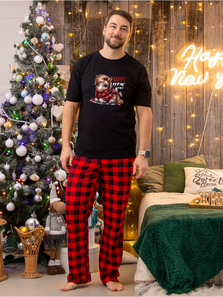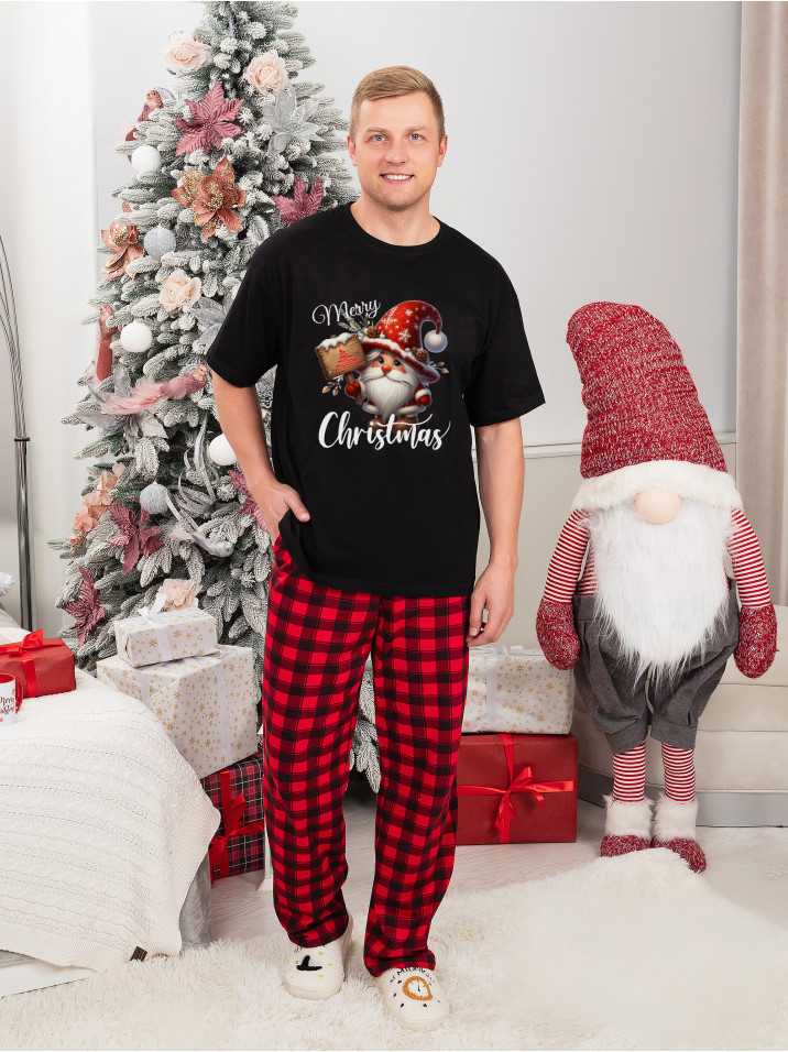 Краткое описание Удобный домашний костюм со штанами для мужчин из 100% хлопка или пижама для дома и сна - носите так как вам нравится. Комплект футболка с оригинальным принтом и пижамные домашние штан... Показать описаниеы в клетку с карманами.