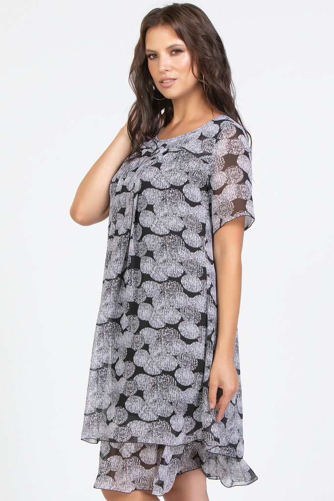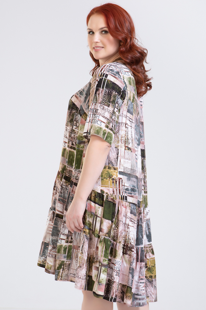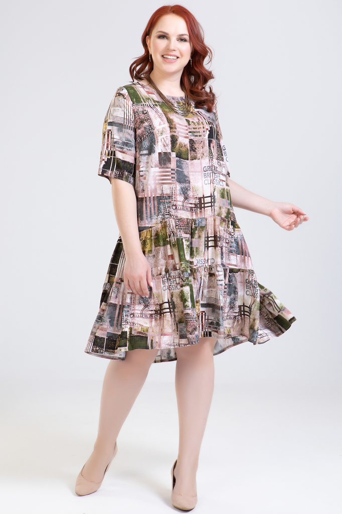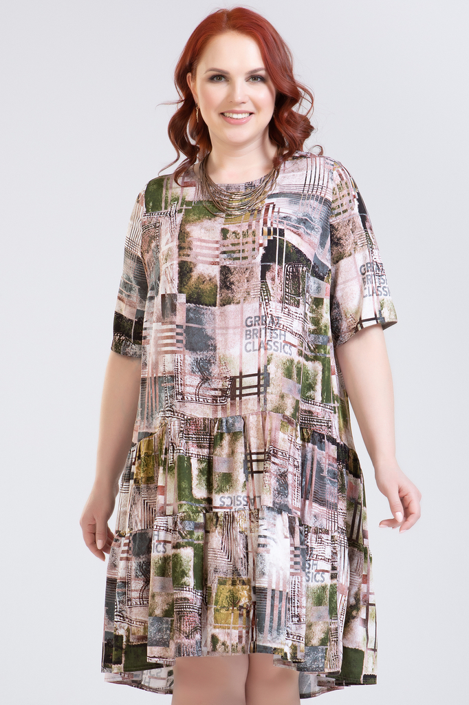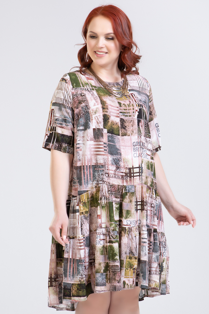 Платье трапециевидного силуэта, с кокеткой по переду и спинке. Горловина круглая, рукав втачной, короткий. Нижняя часть переда и спинки с застроченными складками, на подкладке. По низу подкладки - при... Показать описаниетачная оборка из основной ткани.Наименование ткани. Шифон. Силуэт. Трапециевидный. Длина изделия. 105. Тип рукава. Втачной. Длина рукава. Короткий. Состав (по процентам). 65% пэ, 30% вискоза, 5% эластан. Застежка. Нет. Уход. Машинная стирка 30°С. Производитель. Prima linea/Прима линия Рост модели. 180. Cезон. Весна-лето. Размерный ряд. 48-64. Цвет. Мультиколор. Вид материала. Плательная.