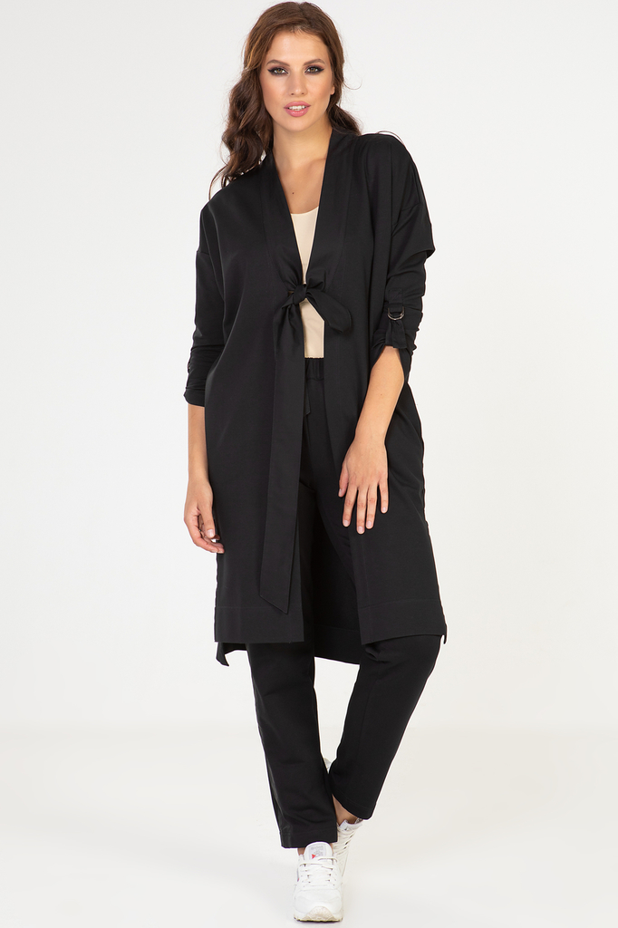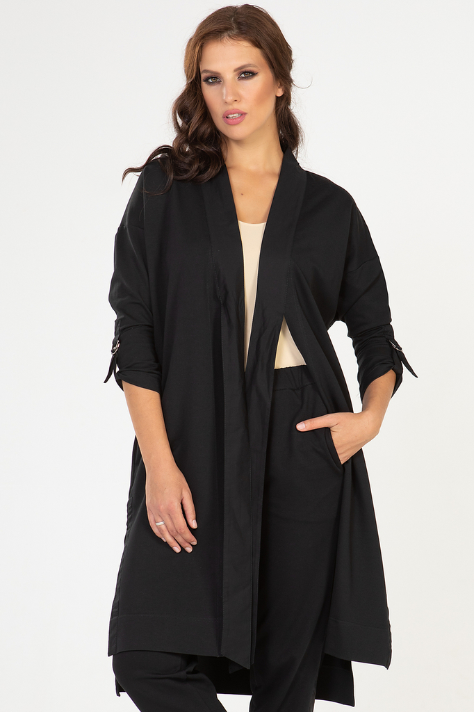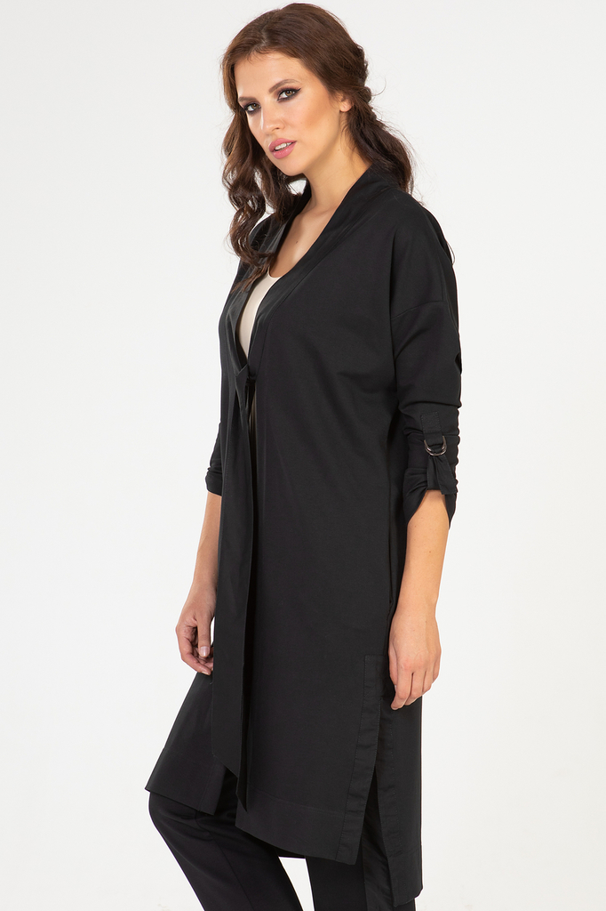 Жакет женский прямого силуэта, разноуровневый, без застежки, с разрезами и карманами в боковом шве. Воротник отложной с цельнокроеными завязками. Плечо спущенное. Рукав втачной, длинный, с патой, прод... Показать описаниеетой в полукольца для регулировки длины рукава.Воротник, цельнокроеный с завязками, паты рукава, обтачки бокового разреза выполнены из хлопка в тон основного сырья. Цвет черный.Наименование ткани. Футер. Силуэт. Прямой. Длина изделия. 110. Тип рукава. Втачной. Длина рукава. Длинный. Состав (по процентам). 95% хлопок, 5% эластан. Карманы. Карманы в боковых швах. Декоративные элементы. Длина рукава регулируется патой, продетой в два полукольца. Уход. Машинная стирка 30°С. Производитель. Prima linea/Прима линия Рост модели. 180. Cезон. Весна-лето. Размерный ряд. 42-68. Цвет. Черный. Вид материала. Плательная.