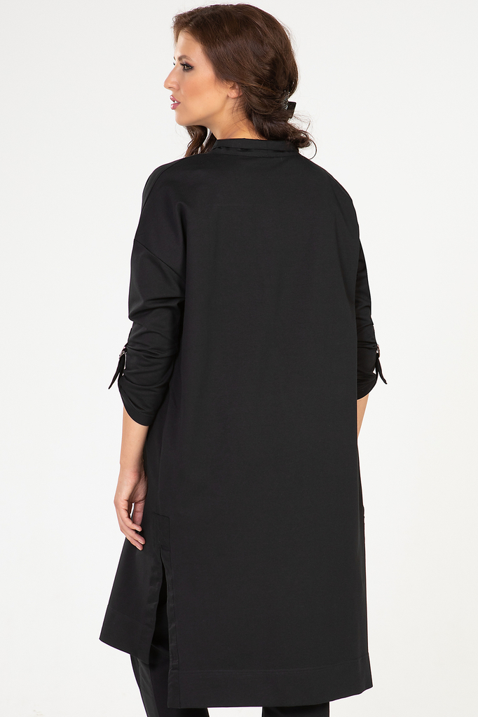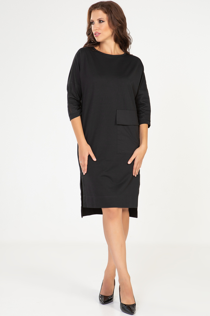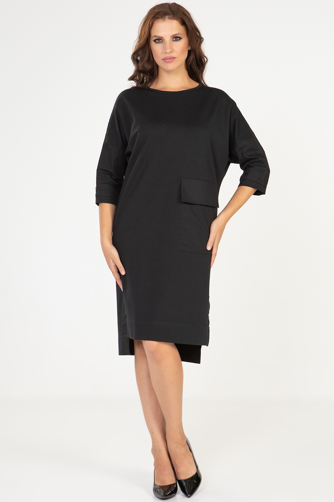 Платье женское прямого силуэта, с цельнокроеным рукавом, разноуровневое., с разрезами в боковых швах. Горловина круглая.Перед с наладным карманом с клапаном. Спинка и рукав с членением.Низ рукава с пр... Показать описаниеитачной манжетой. По верхнему шву рукава, по спинке вертикально и горизонтально втачены отделочные детали из шифона шириной 2,0см в готовом виде.Боковые разрезы обработаны обтачкой.Карман, клапан, обтачки бокового разреза и нижняя часть рукава выполнены из хлопка в тон основного сырья. Цвет черный.Коллекции. Prima Futuro. Наименование ткани. Футер. Силуэт. Прямой. Длина изделия. 109. Тип рукава. Цельнокроеный. Длина рукава. 3/4 Состав (по процентам). 95% хлопок, 5% эластан. Застежка. Нет. Карманы. Карман накладной. Декоративные элементы. Накладной карман с клапаном. Уход. Машинная стирка 30°С. Производитель. Prima linea/Прима линия Рост модели. 180. Cезон. Всесезонный. Размерный ряд. 44-62. Цвет. Черный. Вид материала. Плательная.