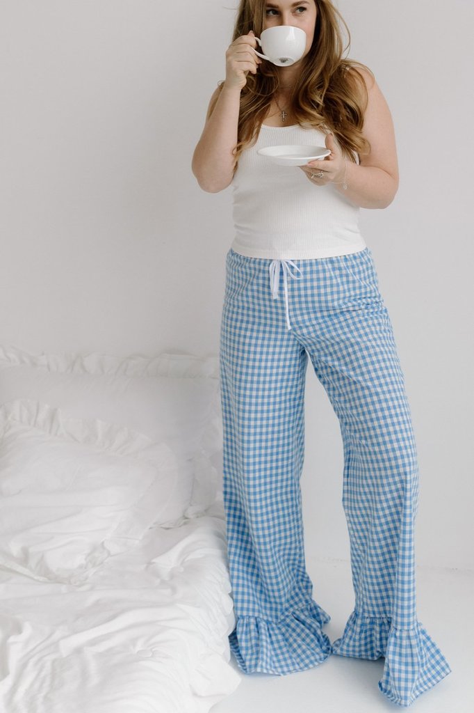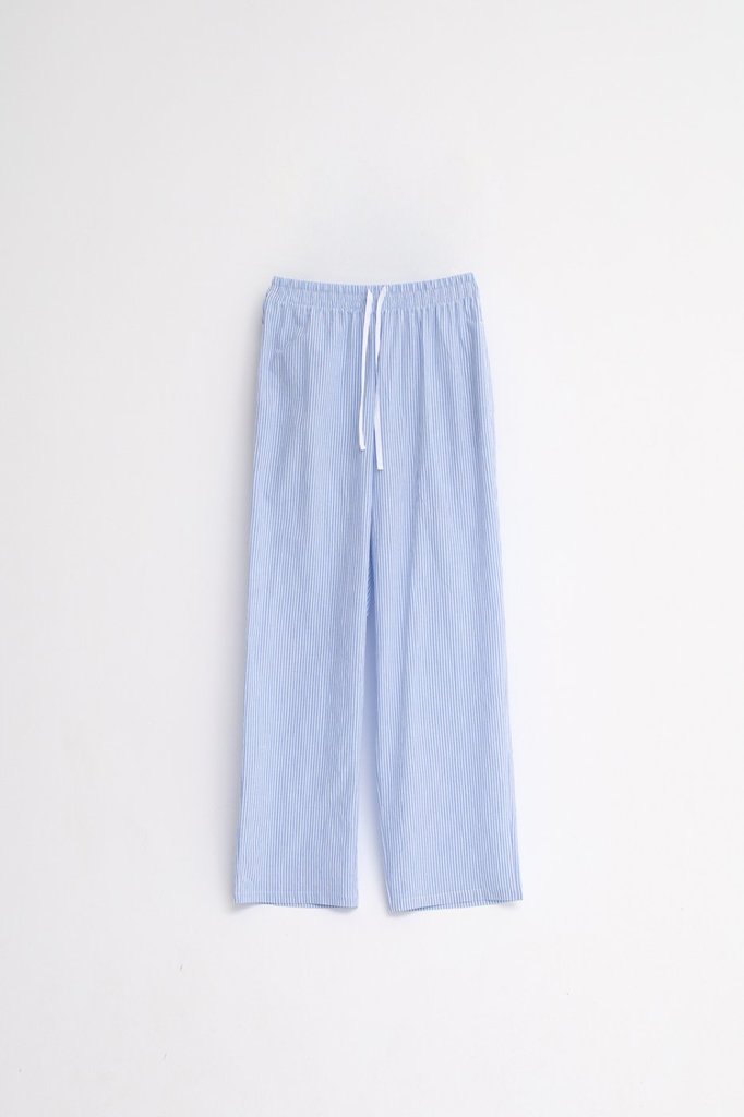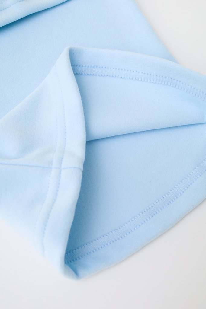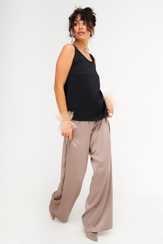 Брюки с цельнокроенным поясом в подгибку с резинкой, дополнительно продернута шляпная резина с одним фиксатором. Низ штанин в подгибку с резинкой. Карманы в боковых швах.