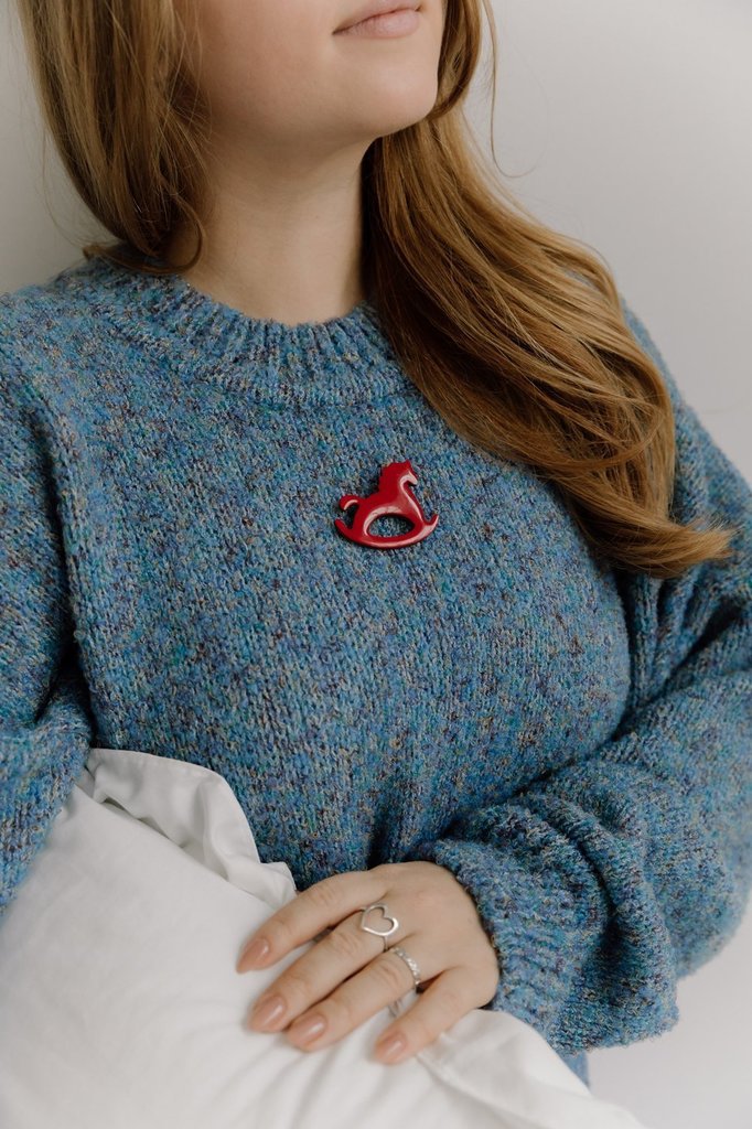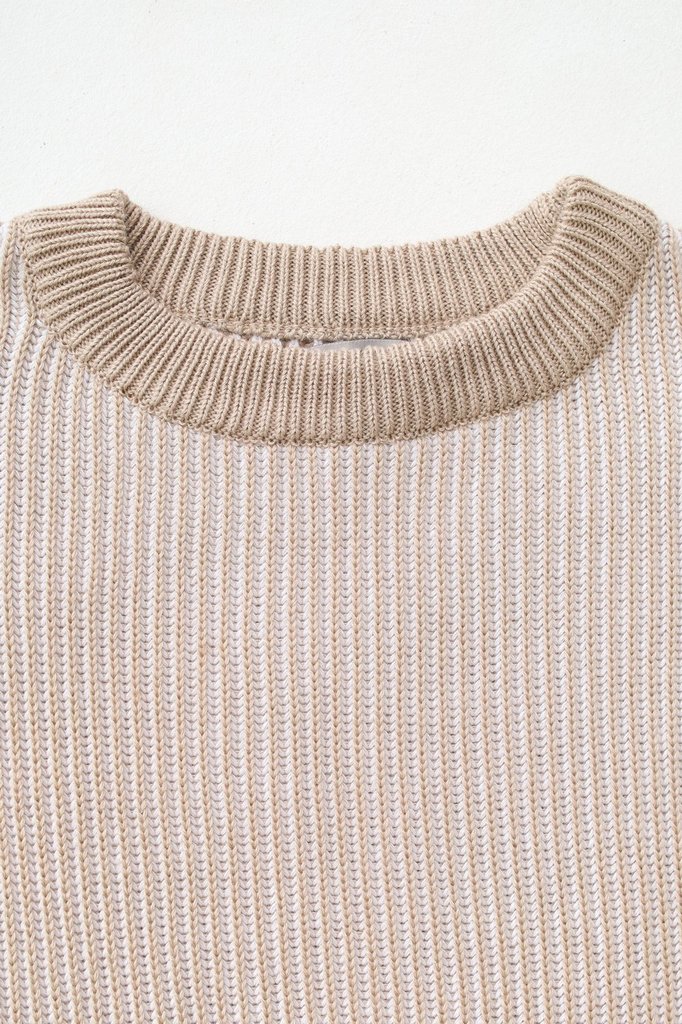 Эффектное двухцветное плотное переплетение с выразительными полосами. Длинные рукава. Дырки на манжетах рукавов и по низу изделия. Круглый вырез горловины