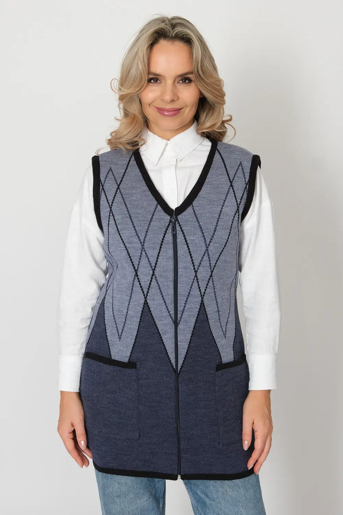 Женский вязаный жилет на молнии с карманами. Теплая жилетка выполнена из высококачественной пряжи с составом 30% шерсть 70% ПАН. Жилет имеет треугольный вырез горловины и функциональные накладные карм... Показать описаниеаны. Пройма и борта окантованы трикотажной бейкой. Жилет выполнен жаккардовым переплетением, образующим красивый, геометрический рисунок. Модель полуприлегающего силуэта подойдет для любого типа фигуры и составит модный и интересный образ с любым низом: брюки, джинсы, юбка.