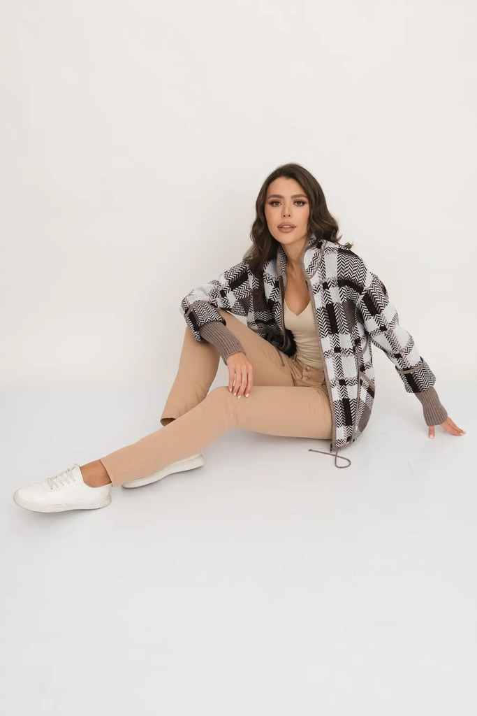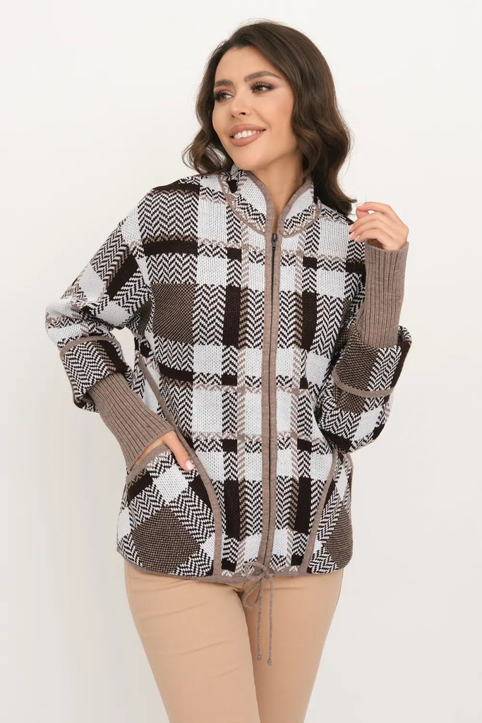 Жакет женский на молнии свободного силуэта с цельновывязанным рукавом 3/4 с удлиненными эластичными манжетами. Воротник-стойка, застежка на молнии. По бокам вязанного жакета два накладных кармана.&nbs... Показать описаниеp; По низу изделия  проложен шнурок. Жаккардовый рисунок образует клетку.