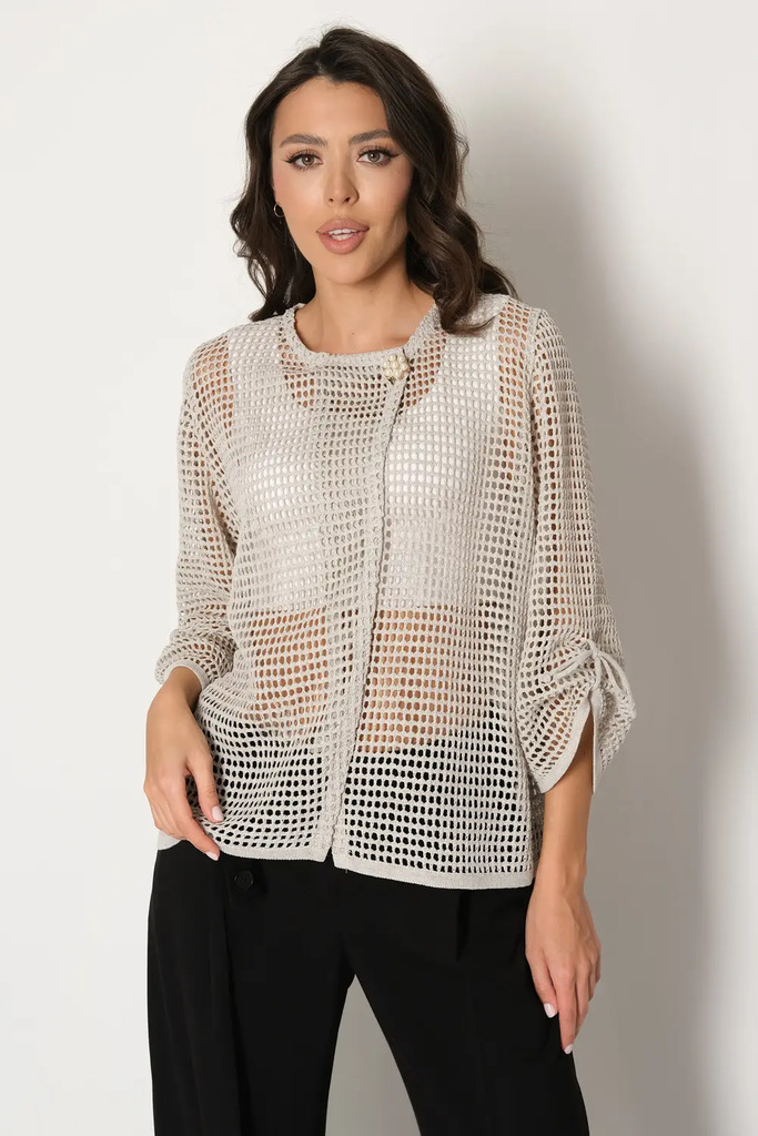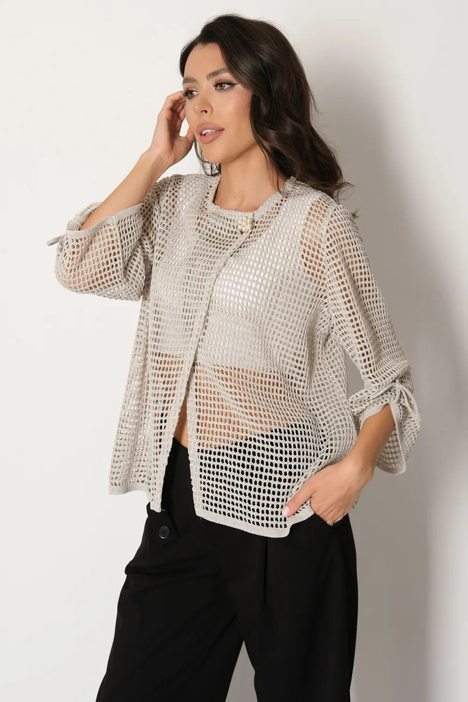Жакет выполнен ажурной сеткой из смесовой пряжи с натуральным хлопком. Горловина круглая, рукава втачные длиной 7/8. Жакет застёгивается на одну пуговицу на горловине, вторая пуговица потайная располо... Показать описаниежена симметрично на передней планке изделия. Жакет можно носить в тёплое время года вторым слоем на топы, блузы, майки.