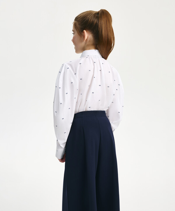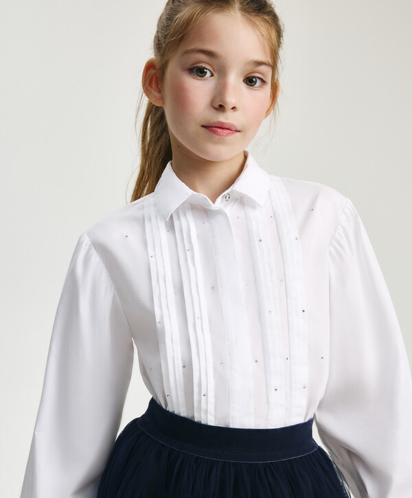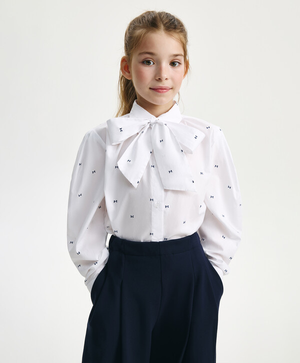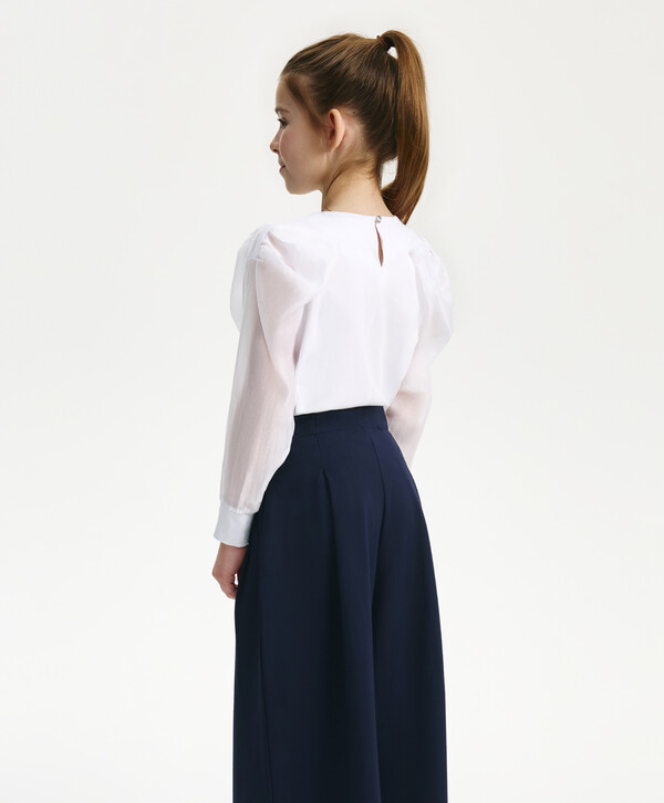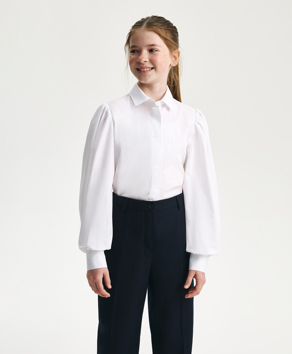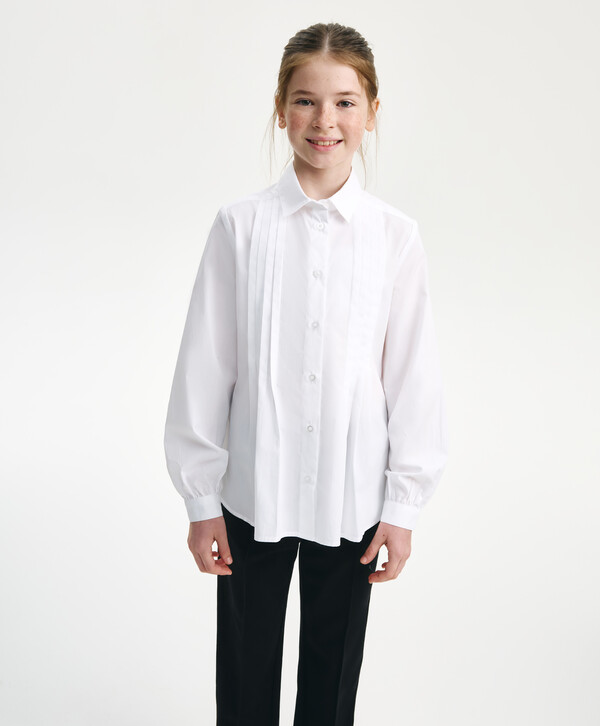 Белая блузка с длинным рукавом – важная составляющая стильных школьных образов девочки. Блузка выполнена из легкого хлопкового текстиля, комфортного в эксплуатации и уходе. Классический прямой крой и&... Показать описаниеnbsp; супатная застежка на пуговицы придают модели строгий и лаконичный вид. Объемные присборенные рукава блузки служат ее главным акцентом, позволяя интегрировать ее как в повседневные школьные комплекты, так и в образы для любых торжественных мероприятий. 100% хлопок