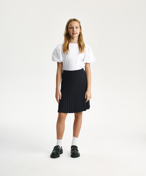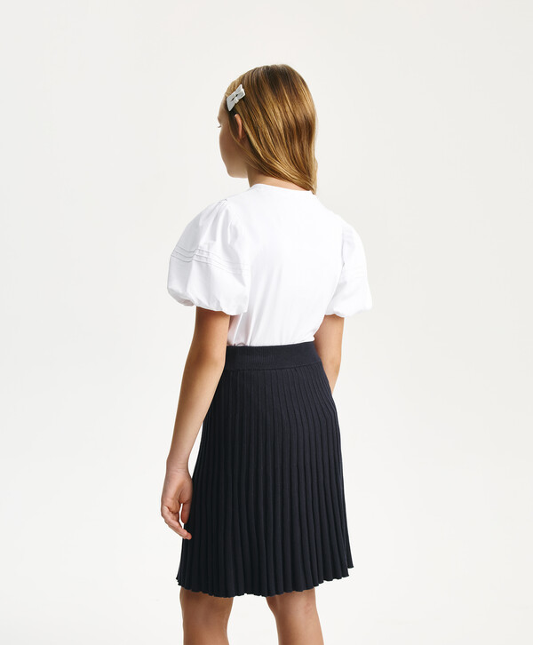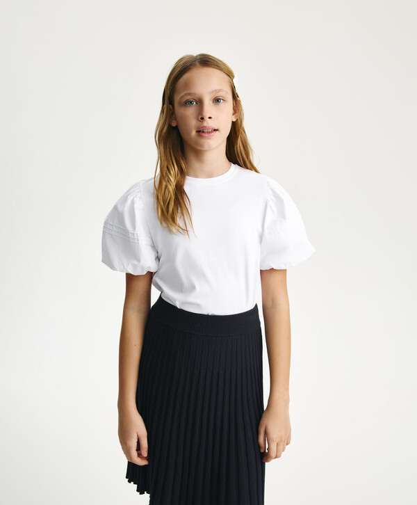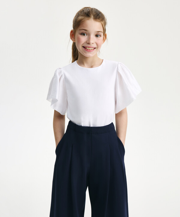 Белая трикотажная блузка прямого кроя с коротким рукавом - отражение актуального минимализма. Изюминка модели - лаконичные рукава-пуфф с мелкими горизонтальными защипами, выполненные из текстиля на т... Показать описаниерикотажной подкладке. Они придают школьной блузке оригинальный вид, привнося в изделие нотки модной этники. Блузка выполнена из мягкого хлопкового полотна с эластаном, очень приятного при тактильном контакте. Лаконичный интеллигентный дизайн делает блузку очень стильной. Она отлично впишется в комплекты и с классическими юбками и брюками, и с дерзкими трубами, и с элегантными палаццо, став основой для модных экспериментов. 95% хлопок,5% эластан