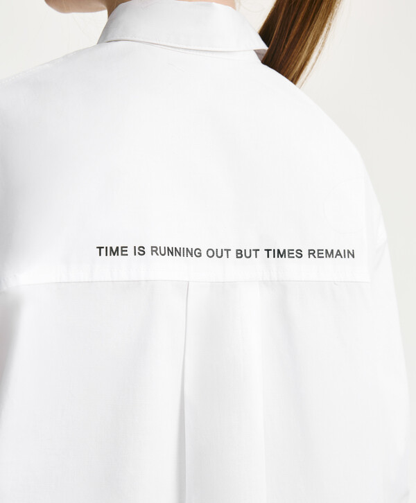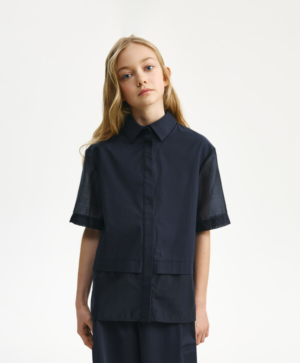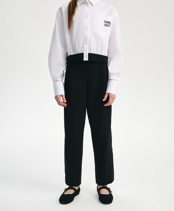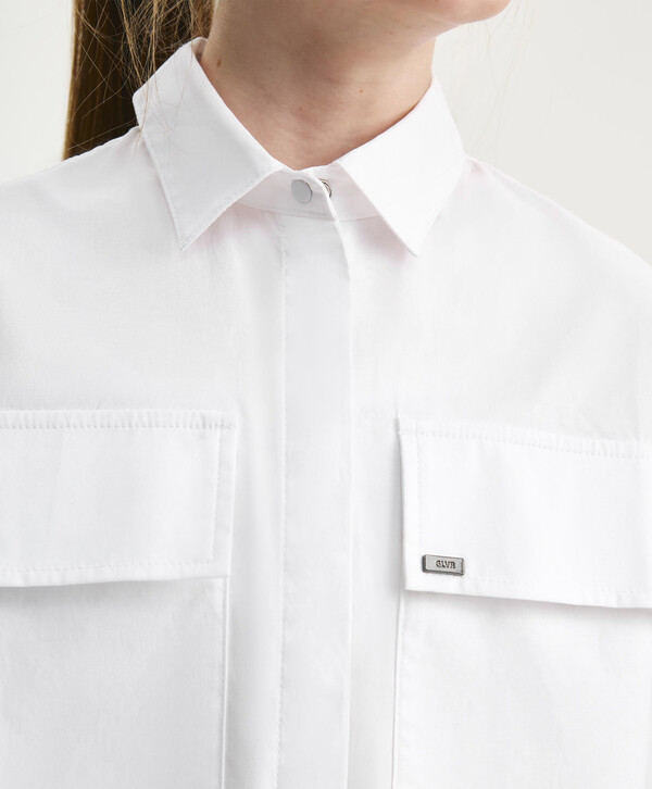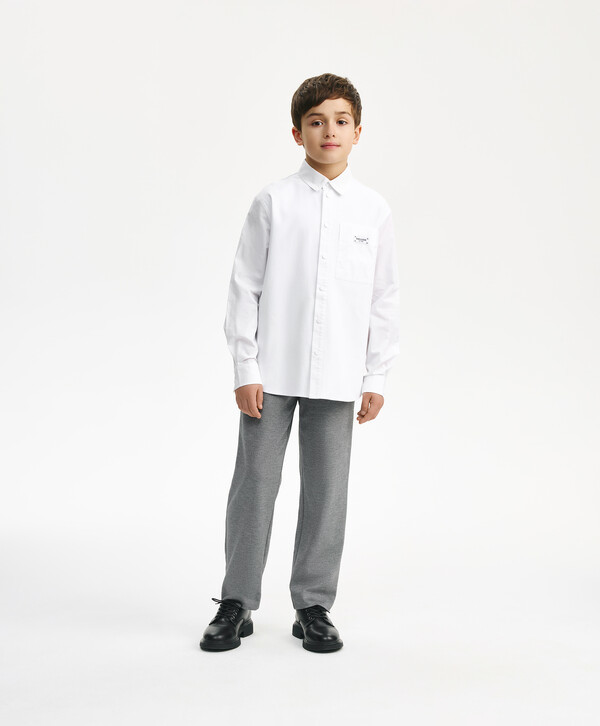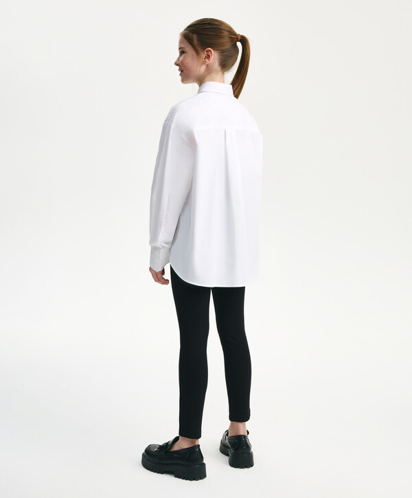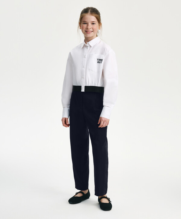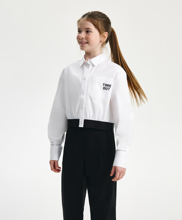 Рубашки школьные с коротким рукавом - неотъемлемая составляющая повседневного гардероба девочки. И как единичные изделия ранней осенью, когда на улице еще тепло, и как часть многослойных образов зимой... Показать описание, они являются базой для создания стильных школьных комплектов. Рубашка укороченная белая выполнена из легкого хлопкового текстиля, очень приятного при тактильном контакте. Модный крой, лаконичный дизайн делают ее образцом рубашки с коротким рукавом для девочек, предпочитающих стильные минималистичные решения. Рубашка оверсайз имеет небольшие разрезы в боковых швах. Неброский шрифтовой принт на накладном кармане придает модели уникальность. Рубашка застегивается на пуговицы, скрытые элегантной супатной планкой. 97% хлопок,3% эластан