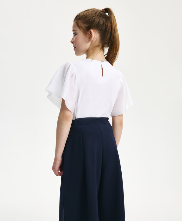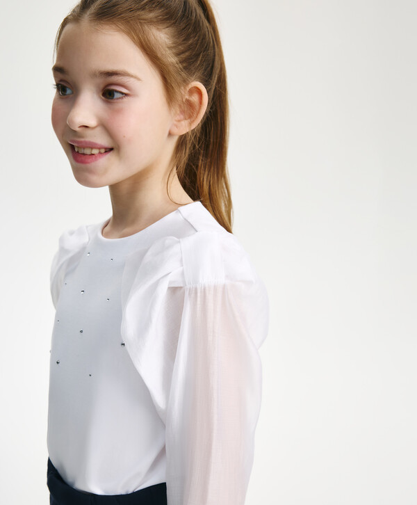 Белая трикотажная блузка выглядит очень изысканно и благородно. Дизайн модели акцентирует внимание на длинных рукавах из полупрозрачного вискозного шифона, собранных в плечевой зоне на лаконичные элег... Показать описаниеантные банты. Манжеты рукавов выполнены из основного материала. Сочетание хлопкового трикотажного полотна с эластаном и легкого воздушного текстиля создает интересную игру фактур, делает блузку выразительной и нарядной. Передняя часть блузки декорирована мелкими сияющими стразами. Блузка имеет застежку-капельку на спинке, фиксирующуюся с помощью навесной петли и пуговицы со стразой. Белая блузка отлично впишется в строгие и в непринужденные образы девочки, гармонично сочетаясь и с классическими юбками и брюками, и с модными трубами, и с элегантными палаццо. основная ткань 95% хлопок,5% эластан; отделочная ткань 80% вискоза,20% полиэстер