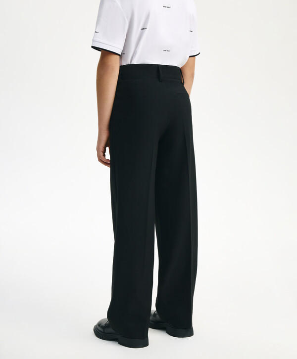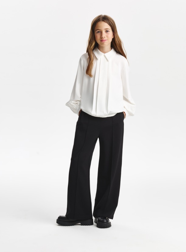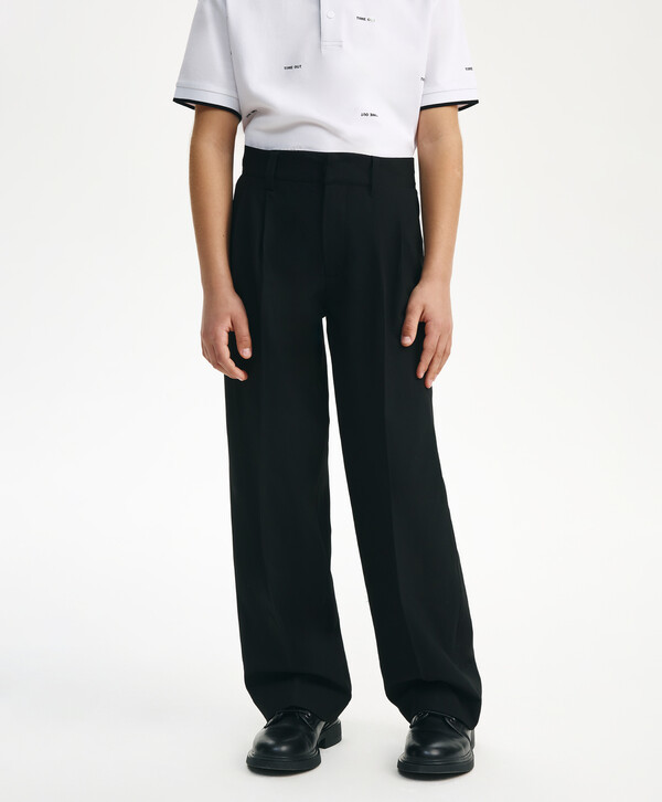 Широкие черные брюки из костюмной ткани – модный выбор, делающий подростка иконой стиля! Прямая свободная форма, защипы на передней части придают модели острый современный вид. Школьные брюки на шелко... Показать описаниевистой подкладке выполнены из поливискозы, отличающейся прочностью, мягкостью, долговечностью и эстетичным внешним видом. Удобные карманы со скосом на передней части и карманы-листочки сзади обеспечивают комфортную эксплуатацию вещи. Брюки застегиваются на молнию, брючный крючок и пуговицу. Они станут прекрасной парой с рубашкой прямого кроя, пиджаком оверсайз, любым изделием из вязаного трикотажа, объемным свитшотом и толстовкой из мягкого футера, создав стильный и выразительный образ в духе времени. верх 68% полиэстер,29% вискоза,3% эластан; подкладка 53% вискоза,47% полиэстер