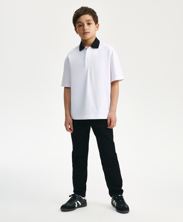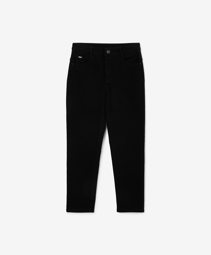 Черные джинсы прямого кроя– универсальная модель, которая легко впишется и в повседневный, и в школьный гардероб мальчика. Джинсы выполнены из прочного и плотного хлопкового денима с эластаном. Специа... Показать описаниельная варка создала смягчающий эффект, наделив изделие легкой, еле заметной потертостью на швах, не препятствующей созданию образов в соответствии с школьным дресс-кодом. Пять стандартных карманов делают модель практичной и функциональной. Небольшой шрифтовой принт на задней части добавляет джинсам современный акцент. Джинсы прекрасно смотрятся с трикотажным пиджаком, рубашкой, любыми вязаными плечевыми изделиями, создавая комфортные для ребенка комплекты на каждый день.