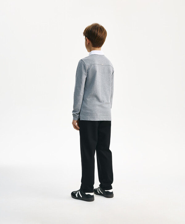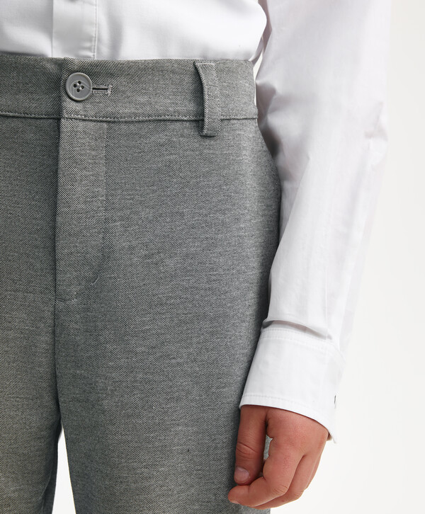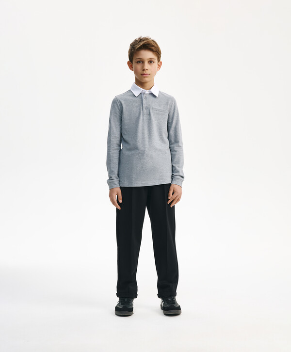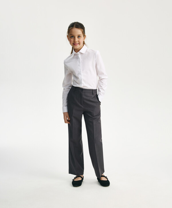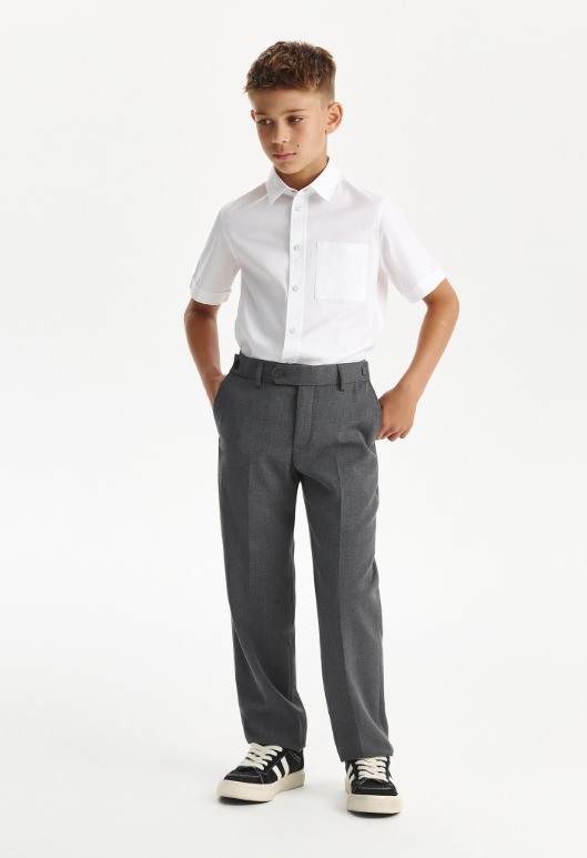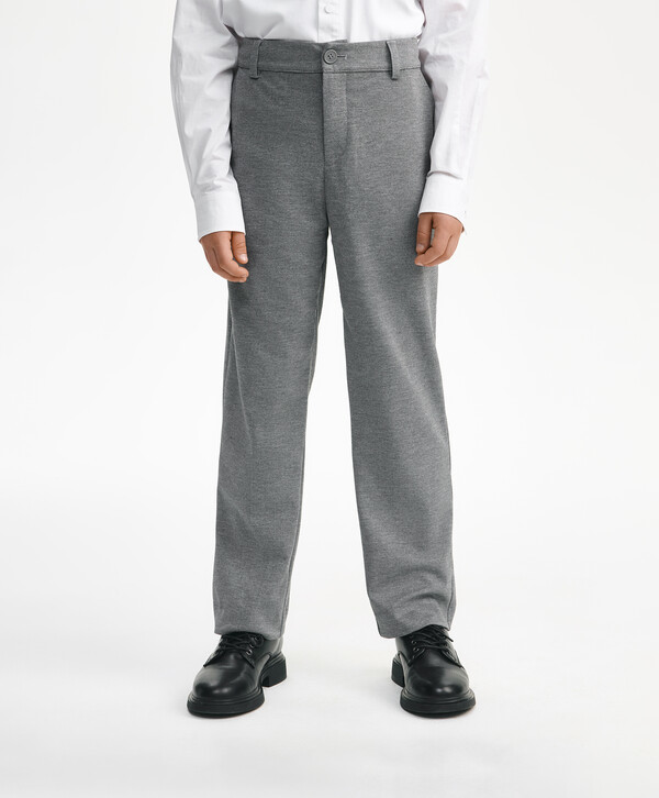 Серые трикотажные брюки – прекрасная альтернатива строгой классике! Брюки прямой формы выполнены из меланжевого трикотажного полотна, по внешнему виду и тактильным ощущениям максимально приближенного ... Показать описаниек текстилю. Они прекрасно держат форму и благодаря резинке на задней части пояса, очень комфортны в эксплуатации. Внутренняя часть брюк частично усилена шелковистой подкладкой. Брюки застегиваются на молнию и пуговицу, имеют удобные карманы со скосом, а также функциональные карманы-листочки на задних половинках. Серые школьные брюки легко комбинируются с рубашками и сорочками любого кроя, лонгсливами, джемперами, любыми изделиями из вязаного трикотажа и могут быть дополнены пиджаками и жилетам для создания образов, уместных на торжественных или официальных мероприятиях. верх 74% полиэстер,23% вискоза,3% эластан; подкладка 53% вискоза,47% полиэстер
