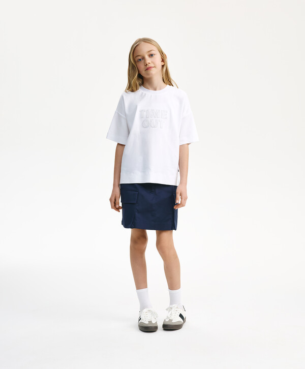 Белая футболка с коротким рукавом – прекрасный вариант для повседневных школьных образов девочки. Футболка выполнена из мягкого, гладкого, тактильно приятного мерсеризированного хлопкового интерлока. ... Показать описаниеСвободный крой, заниженная линия спинки, небольшие разрезы в боковых швах создают динамичный силуэт. Шрифтовой декор на передней части добавляет модели интересный модный акцент. Футболка прекрасно сочетается с юбками, брюками, джинсами любой формы, длины, цвета.
